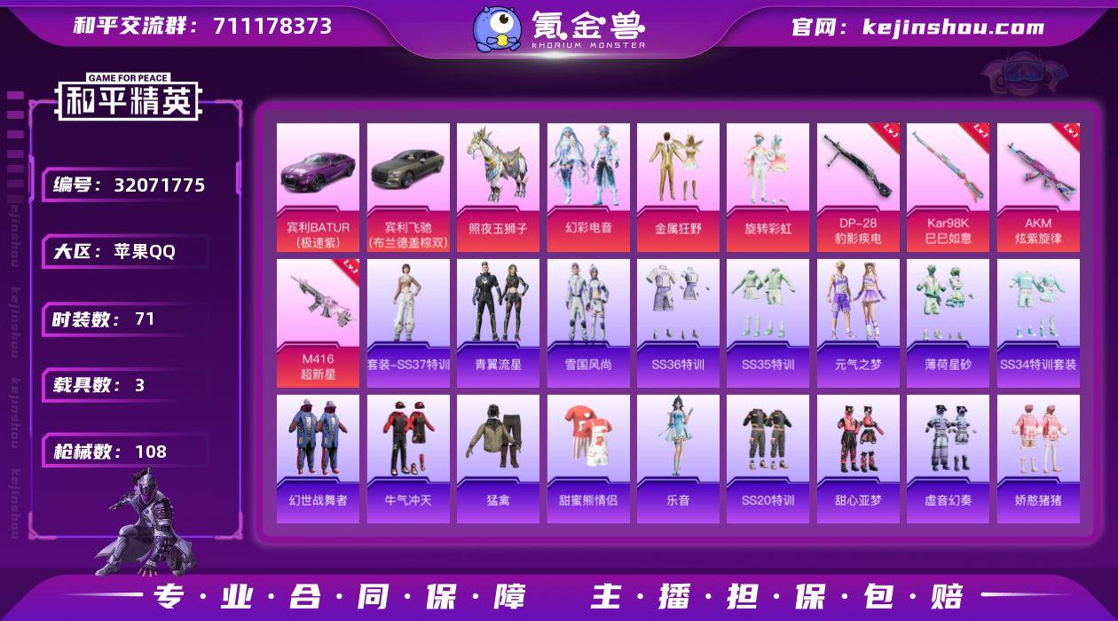 【M4超新星3载具4特效枪3粉装 秒换绑不用等】 苹果Q区-36273热力值-71套装-108枪皮 【3载具】 宾利BATTUR(极速紫) 宾利飞驰(布罗德盖棕双色) 照夜玉狮子【3粉装】 旋转彩虹 金属狂野 幻彩电音【4特效枪】 M416-超新星(3级) AKM-炫紫旋律(7级) Kar98K-巳巳如意(5级) DP-28-豹影疾电(5级)【80热门】 深海小丑鱼 SS27特训 SS26特训 SS25特训 SS23特训 SS22特训 SCAR-L-玉兔迎春 GROZA-恐龙拽拽 Mk47-乌木金纹 UZI-娇憨猪猪 M249-彩虹符号 MG3-幻世战舞者 M762-第五大道 长空猛禽 虚音幻奏 甜心亚梦 甜蜜熊情侣 青涩时光 牛气冲天 霓虹街区 黑色伏地魔 粉红小猪 顶瓜瓜 MG-36-薄荷星砂 SS34特训 乐音 蜜獾-鸡智如我 SS19特训 SS20特训 SS21特训 SS30特训 ACE32-冰晶雪宝 青翼流星 SS31特训 SS33特训 SS32特训 极速光影 雪绒豹 SS36特训 老实芭蕉 战术大师 云朵鹅 AKM-彩虹符号 AWM-恐龙拽拽 撬棍-幻世战舞者 Mini14-炫彩节奏 M417-玩趣呆呆 Mk14-薄荷星砂 AUG-紫晶流影 AMR-鸡智如我 MG3-乌木金纹 平底锅-飞驰魅影 平底锅-甜心亚梦 平底锅-娇憨猪猪 AKS-74U-鸡智如我 烟雾弹-冰氧夏日 SS35特训 薄荷星砂 元气之梦 AUG-异域银装 十字弩-异域银装 雪国风尚 DBS-幻彩电音 大砍刀-青龙偃月刀 十字弩-异瞳寒姬 S12K-极意拳锋 SVD-云朵鹅 M762-云朵鹅 P90-玩趣呆呆 SPAS-12-云朵鹅 沙漠之鹰-快闪甜心 平底锅-空岛之星 SPAS-12-狂鲨锋刃 平底锅-快闪甜心 平底锅-惊鸿侠骨 M249-冰晶雪宝 沙漠之鹰-云朵鹅 SS37特训 大砍刀-云朵鹅 破片手榴弹-呆爆全场【2飞行器】 星夜魔法师飞行翼 炫彩糖果飞行器【13背包】 快闪甜心背包(3级) 第五大道背包(3级) 朗月武圣背包(3级) 异域银装背包(3级) 甜心亚梦