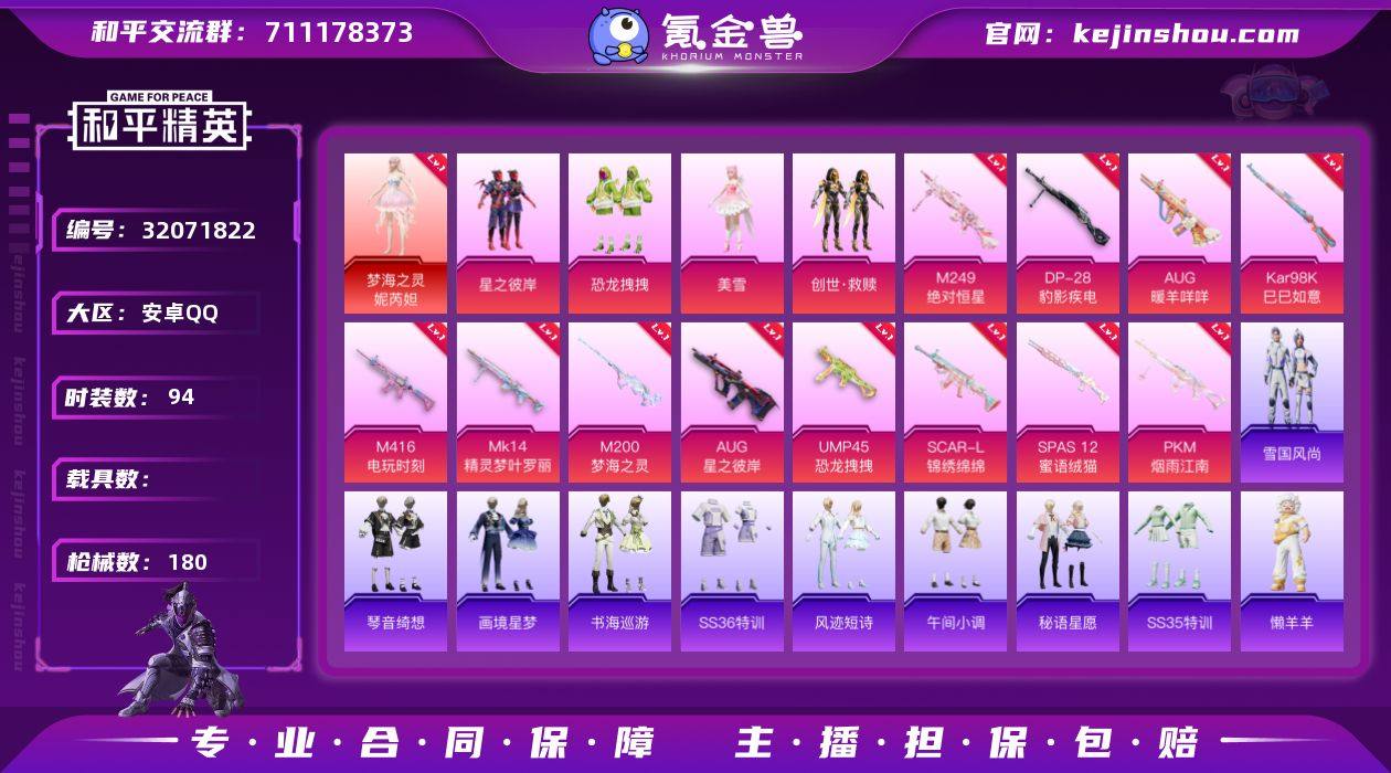 【女号3级红装12特效枪5粉装 秒换绑不用等】 安卓Q区-61597热力值-94套装-180枪皮 【1红装】 梦海之灵-妮芮妲(3级)【5粉装】 蜜语绒猫 星之彼岸 恐龙拽拽 创世·救赎 角色-美雪【12特效枪】 M200-梦海之灵(3级) M249-绝对恒星(4级) UMP45-恐龙拽拽(5级) SCAR-L-锦绣绵绵(5级) AUG-星之彼岸(5级) Mk14-精灵梦叶罗丽(4级) SPAS-12-蜜语绒猫(4级) Kar98K-巳巳如意(5级) AUG-暖羊咩咩(5级) M416-电玩时刻(5级) PKM-江南烟雨(5级) DP-28-豹影疾电(4级)【160热门】 醒狮腾龙 团圆交子 瑞龙福将 SS27特训 SS25特训 SS24特训 Mk47-洛神天依 M762-乌木金纹 M416-乌木金纹 GROZA-乌木金纹 GROZA-恐龙拽拽 Mk47-乌木金纹 UMP45-蓝色火焰 MG3-幻世战舞者 AKM-虎虎生威 AKM-春暖花开 AKM-星之彼岸 M416-蓝色火焰 AUG-怪笑疯兔 长空猛禽 骑行爱好者 霓虹街区 懵萌河马 魅力单车 红色运动 黑色伏地魔 纯真浪花 M762-瑞龙福将 萌趣绒叽 平底锅-画境星梦 MP5K-未来领航者 蝶吟花词 冰河战士 雏菊兔兔 SS34特训 TMP-9-江南烟雨 SS18特训 战术弩-江南烟雨 SS17特训 SS19特训 龙魂突击队 SS29特训 萝兰蝴蝶 破片手榴弹-爆破雪人 SS30特训 青团波波 鱼渊荷华 糖糖葫芦 SS28特训 海盐绵绵冰 M16A4-冰河战士 燕燕于飞 SS31特训 SS33特训 平底锅-梦幻舞会 SS32特训 巳巳如意 蜜獾-精灵梦叶罗丽 童真绒兔 棉花软糖 M762-雏菊兔兔 Mini14-雏菊兔兔 焰鹰斗篷 R1895-雏菊兔兔 幽夜迷踪 曼妙人鱼 SS36特训 热情海星 湖雨初晴 AKM-江南烟雨 智谋强哥 战术大师 S686-蜜语绒猫 Mk14-电糖天使 MK20-H-星梦奇缘 S1897-精灵梦叶罗丽 大砍刀-黑金刀 平底锅-许七安 AWM-恐龙拽拽 MK20-H