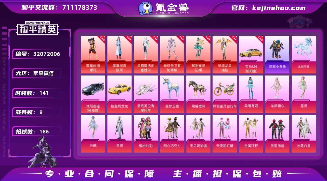 苹果 微信-6神装-45粉装-28特效枪-8载具-13粉色飞行器-106223热力值-6王牌印记-141套装-186枪皮 【红色载具】:宝马M4(灿阳金)(五级) 【红色神装等级】:魔童闹海-敖丙(一级),魔童闹海-哪吒(五级),灵猫魔法师-塞维尔(一级),最终圣卫者-帕修斯(一级),辉羽雀灵-初翊(一级),圣域龙灵-瑞拉(一级) 【红色角色神装】:魔童闹海-敖丙,魔童闹海-哪吒,灵猫魔法师-塞维尔,最终圣卫者-帕修斯,辉羽雀灵-初翊,圣域龙灵-瑞拉 【热门品类】:粉装-缤纷油彩,套装-深海小丑鱼,套装-小丑鱼,套装-潮萌小黄鸭,角色-六号稻草人,套装-红熊茄茄 【粉色套装】:粉装-甜心巧克力,粉装-宝贝奶油派,粉装-天使彩虹糖,粉装-金属狂野,粉装-缤纷油彩,粉装-放客神游,粉装-冰霜白皇,粉装-炙焰红王,粉装-甜梦小狐,角色-呆萌星弥,角色-小可学妹,粉装-暖暖奶龙,粉装-傲傲奶龙,粉装-镜光幻境,角色-严莉莉,角色-小蓝,角色-美雪,角色-美琪,角色-千金淑猫,角色-智耀战神,角色-凤凰座 一辉,角色-仙女座 瞬,角色-天鹅座 冰河,角色-天龙座 紫龙,角色-智慧纱织,粉装-星穹咏叹调,角色-时光之誓,角色-狂魅哈莉,角色-冷漠罗丽,角色-绯月迷踪,角色-宁雨蝶,角色-天穹,角色-罗征,角色-荧海星豚,角色-绯穹魔姬,角色-奇迹舞步 贝贝,角色-奇迹舞步 雅雅,角色-奇迹舞步 美琪,角色-奇迹舞步 美雪,角色-花灵,角色-冰魄,角色-星渊,角色-羊梦糖心,角色-异瞳寒姬 【粉色枪皮等级】:SCAR-L-童趣迷兔(五级),SCAR-L-魔童闹海 哪吒(五级),M416-超新星(九级),M416-灵猫魔法师(一级),GROZA-巴啦啦小魔仙(一级),GROZA-无垠阁(一级),AUG-星梦奇缘(四级),AUG-圣斗士星矢(一级),蜜獾-荧海星豚(一级),UZI-圣斗士星矢(二级),UMP45-宁雨蝶(四级),Vector-最终圣卫者(四级),Vector-绯穹魔姬(一级),AKS-74U-星穹咏...