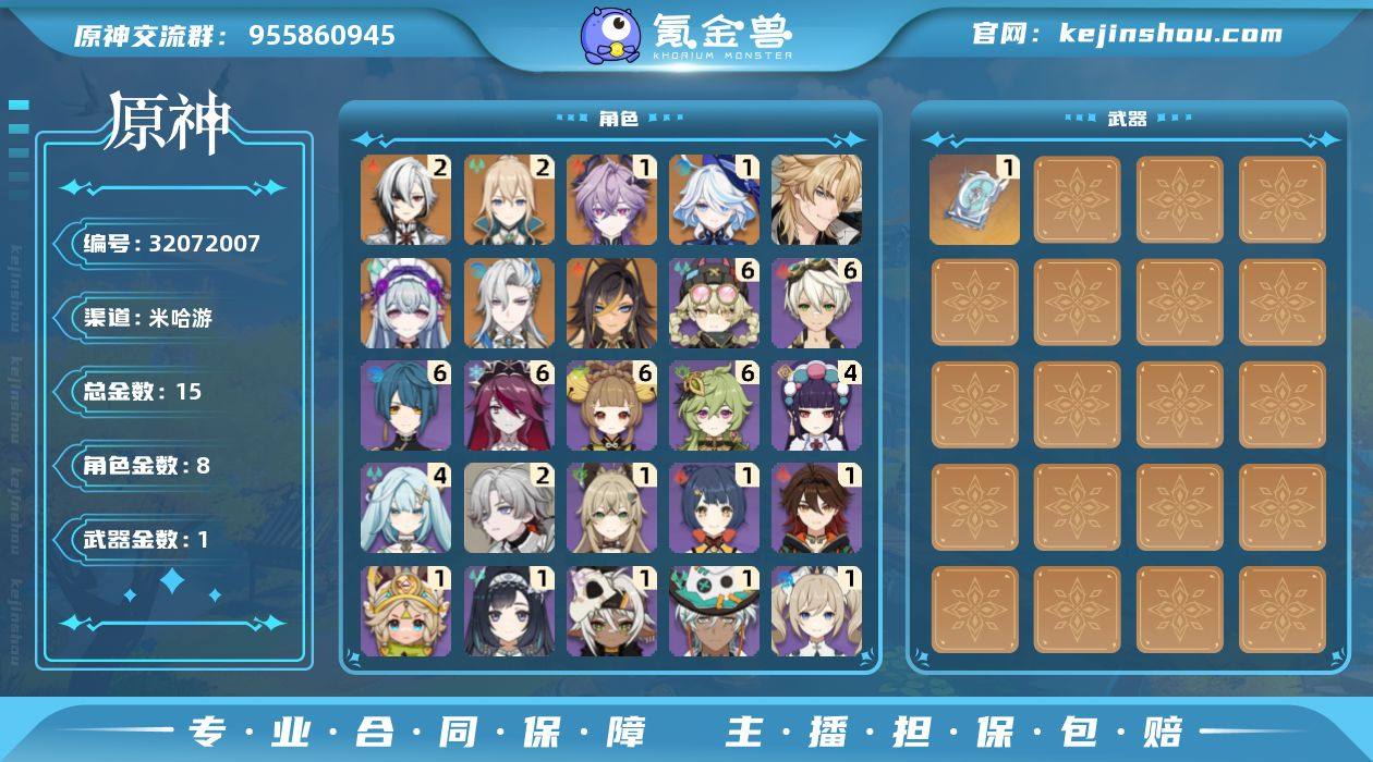 邮箱: 不送邮/死邮 总黄数: 15 冒险等级: 56 2命金色角色: 二命琴,二命阿蕾奇诺 1命金色角色: 一命芙宁娜,一命杜林 0命金色角色: 迪希雅,那维莱特,梦见月瑞希,法尔伽 拥有武器: 四风原典 1精武器: 四风原典 亮点: 极品欧号配对完整,都是高练度