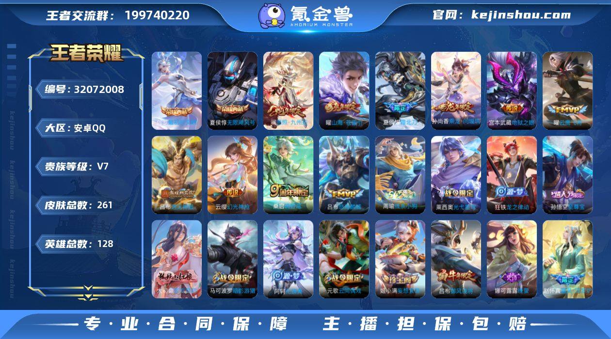 实名: 可修改 性别: 男号 贵族等级: V7 英雄数: 128 皮肤数: 261 荣耀水晶: 无限飓风号,最初的交响 传说皮: 云鹰飞将,地狱之眼,山海·苍雷引,遇见神鼓,乘龙·问璇玑,幻光神枪 限定皮: 游园惊梦,御风骁将,至尊宝,五谷丰年,怒海麟威,夏侯惇霜北刀,鸣野蒿,逐霄战戟,愿照·九州拓 亮点: 【优质装备】:无限飓风号(高达),最初的交响(伽罗典藏),云鹰飞将(小将军),地狱之眼,山海·苍雷引(电光曜子),遇见神鼓