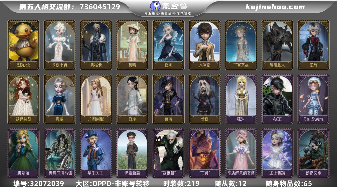 账号类型: 手机账号 时装数: 219 时装: 26号守卫-B.Duck,病患-星辰,雕刻家-动物女巫,古董商-白泽,红夫人-夜潮,画家-江户川乱步,“杰克”-白纹大触,“杰克”-忘川渡人,机械师-Re-Swim,空军-菖蒲,勘探员-雀舌,勘探员-迷途诗人,昆虫学者-曼陀罗,盲女-海西遗风,盲女-不愿醒来的女孩,盲女-吉尔达,盲女-海女巫,梦之女巫-羽蛇,梦之女巫-红龙夫人,“囚徒”-太宰治,入殓师-哈姆雷特,入殓师-守钟人,宿伞之魂-安魂曲,宿伞之魂-残花泪,宿伞之魂-阴阳司公,摄影师-月下绅士,摄影师-阿波罗,“使徒”-荒野女巫,守墓人-壁画修复员,调香师-今夜不再,调香师-冰上舞蹈,舞女-香薰桑拿,小提琴家-衔尾蛇,“小女孩”-滚滚伙伴,医生-采药人,医生-雨中曲,园丁-熊猫保育员,园丁-宇宙女巫,佣兵-B.Duck潮,邮差-“亡灵”,邮差-秋日随想,隐士-典狱长,“小女孩”-欧律狄刻,心理学家-长夜,园丁- 初晴,医生-流萤,爱丽丝·德罗斯-片刻闲暇,爱哭鬼-摩诺,医生-永生花,渔女-百万人鱼,红蝶-硫火,“博士”-“裁纸机”,小说家-“伊始新篇”,邮差-华生医生,雕刻家-善忘的海马体,空军-梅爱丽