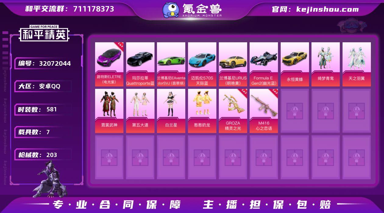 一颗水晶 满级载具车 9粉装 4特效枪 7载具 12印记 可二次 可修改实名 【六级载具】六级路特斯ELETRE(电光紫)(满级路特斯) 【热门装扮】羊梦糖心,天龙座 紫龙,狂魅哈莉,绮梦青鸾,天之羽翼,霓裳武神,第五大道,白兰星,憨憨奶龙 【载具】路特斯ELETRE(电光紫),迈凯伦570S(天际蓝),玛莎拉蒂Quattroporte(夜幕蓝),兰博基尼Aventador SVJ(翡翠绿),兰博基尼URUS(明艳黄),Formula E Gen2(幽光蓝),永恒黄蜂 【稀有枪皮】GROZA-精灵之光,Kar98K-巳巳如意,DP-28-豹影疾电,M416心之恋语 【七级特效枪】七级M416-心之恋语 【五级特效枪】五级Kar98K-巳巳如意,五级DP-28-豹影疾电 【三级特效枪】三级GROZA-精灵之光 【紫色装扮】SS34特训套装,决胜时刻,冰川格斗者,刚毅裁决者,北国孤狼,千禧之恋,吉莉礼服,和平特警,圣诞大吉,坚韧舞者,SS2特训,SS33特训套装,诡诞巡游,SS5特训,夏日音浪,滨海厨神,活力之心,海岛探路者,涂山之恋,滨海假日,潮流炫酷,灰色格斗者,灼焰舞者,炫蓝之夏,燃烧卡路里,牛气冲天,牛气满满,完美偶像,探宝勇士,帅气教官,幻世战舞者,怒火燎原,战地督导,沙漠兵团,柠萌假日,SS19特训,醇脆可可,甜心亚梦,虚音幻奏,SS20特训,团圆交子,瑞龙福将,SS18特训,SS17特训,冰暴轰轰,异彩...