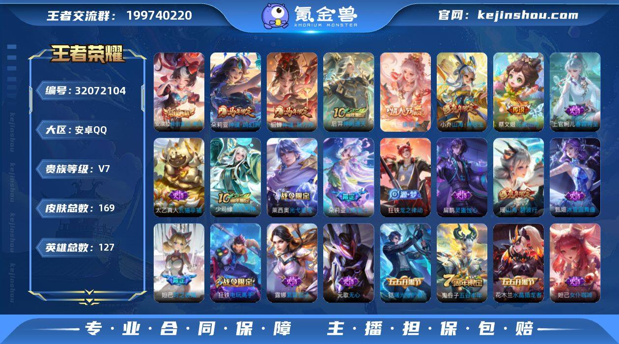 【王者荣耀】珍品无双0 典藏1 无双0 珍品传说0 传说7 史诗49 英雄127 皮肤169 贵族7级 荣耀典藏:颠倒童话·魔镜__传说皮肤:花朝如约|瑶-时之祈愿|山海·琳琅生|续相思|神树通天|神骥·鸣幻洲|神骥·聚万邦__稀有限定:蔷薇恋人|梁祝|山海·碧波行|神器·万象笔|时之彼端|白昼王子|妲己-时之奇旅|大漠名商|电玩高手|古海寻踪|海滩派对|海盐诗旅|幻夜卜梦|皇家上将|火炮绅士|金庭之子|魔术师|匿光破解者|女武神|千军破阵|擒涛扼浪|驱傩正仪|燃音魔法|沙漠行僧|探海日志|天穹祈灯|万华元夜|无心|五谷丰年|午后时光|演武夺筹|阴阳师|暗隐猎兽者|缤纷独角兽|冰冠公主|冰雪圆舞曲|地狱岩魂|鬼剑武藏|节奏热浪|魅力维加斯|女仆咖啡|偶像歌手|绅士熊喵|圣诞恋歌|水果甜心|水晶猎龙者|赵云-未来纪元|星夜王子|鹰眼统帅|幽灵船长|钟无艳-超时空战士|逐浪之夏|紫霞仙子|噬灭天穹|虞姬-夏日便利店|曙光守护者|心灵骇客|谧流熔炉|云中旅人|玲珑珍味|流音漫舞|灵卜魔法|苍威无极|落雪兰心|灵蛊蚀心|龙之律动|布丁狗之约|虚灵犬护|逆浪荇歌|孙策-百相守梦|周瑜-百相守梦|幻珠鲛人|黄忠-百相守梦|光弋星穹|往忆晖光|巫礼祀神|鹤鸣心笺|小乔-线条小狗|周瑜-线条小狗|瓦猫非猫|春霖将至__优质皮肤:尼罗河女神|一千零一夜|孤猎|木偶奇遇记|冰刃幻境|森|启蛰|伊势巫女|画中游|芝加哥教父|绝影神枪|赤焰之缨|福禄兄弟|前尘|花间舞|棒球奇才|东海龙王|蔷薇王座|精准探案法|加勒比小姐|异域舞娘|精灵公主|万圣前夜|长夏之忆|暗都幽影|功夫炙烤|潮玩探月行|鲨炮海盗猫|野性能量|丁香结|虹云星官|功夫老勺|幻想奇妙夜|海滩丽影|死亡骑士|少女阿狸|天使之翼|玩偶对对碰|宫本武藏-未来纪元|忍·炎影|爱心护理|金色潮汐|漠中幻影|时空谍影|幻泉雾影|潮玩造梦师|危途狂花|拳王|白色死神|哥特玫瑰|西施-雪境奇遇|星梦巡礼|灵卦秘语|缤纷绘卷|掌控之力|铁...
