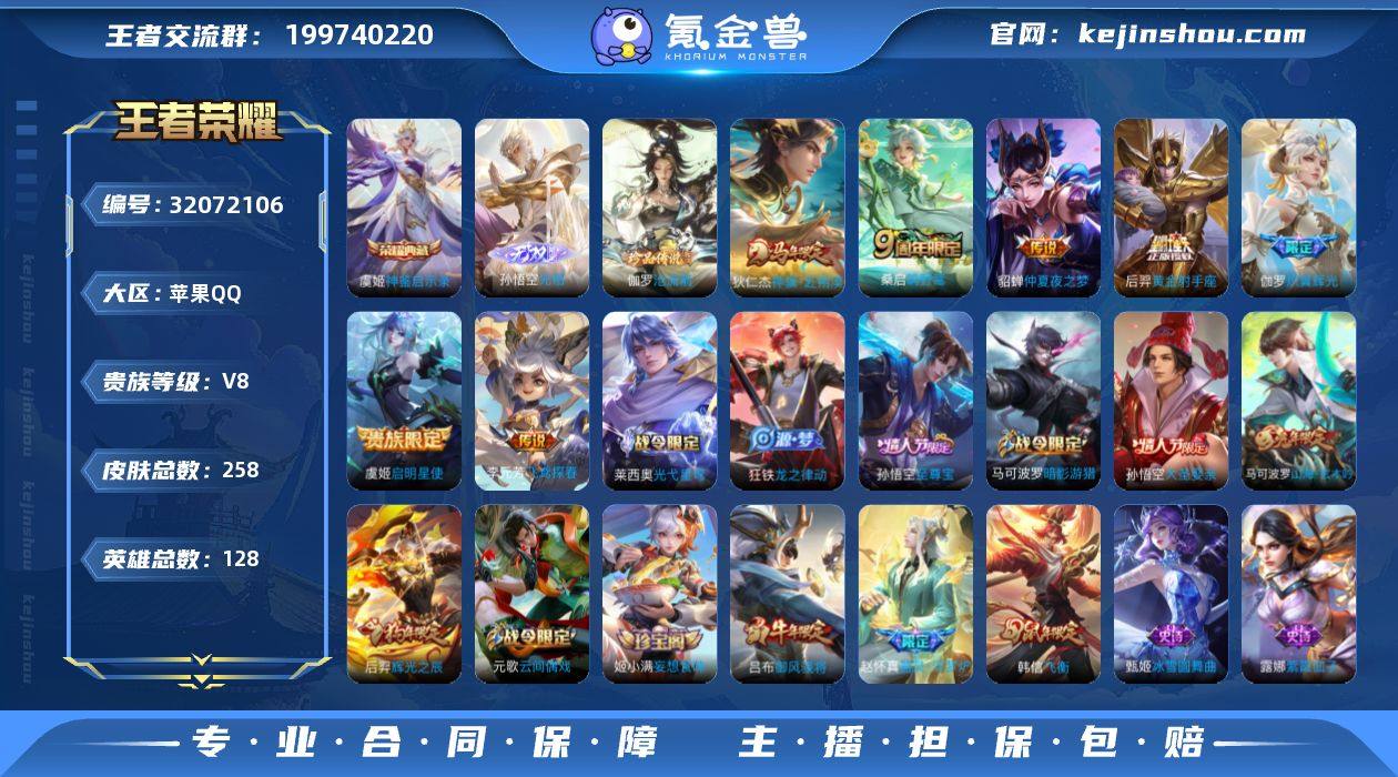 【王者荣耀】珍品无双0 典藏1 无双1 珍品传说1 传说8 史诗80 英雄128 皮肤258 贵族8级 荣耀典藏:神鉴启示录__无双皮肤:无相__珍品传说:沧流箭__传说皮肤:鸣野蒿|启明星使|仲夏夜之梦|狄仁杰-超时空战士|黄金射手座|飞鸢探春|炽翼辉光|神骥·赴朔漠__稀有限定:御风骁将|至尊宝|大圣娶亲|飞衡|蔷薇恋人|李小龙|山海·玄木吟|狮舞东方|拒霜思|暗影游猎|白昼王子|百解令|大漠名商|繁星吟游|古海寻踪|海滩派对|海盐诗旅|后羿-如梦令|皇家上将|辉光之辰|混沌棋|剑破天穹|江河有灵|狂想玩偶喵|黎明之约|迷踪丽影|魔术师|擒涛扼浪|穷奇|驱傩正仪|燃音魔法|沙漠行僧|朔风刀|探海日志|饕餮|醍醐杖|天狼征服者|天穹祈灯|万华元夜|妄想食味|无心|五谷丰年|纤云弄巧|星空之诺|驯魔猎人|演武夺筹|疑决卦|阴阳师|银河之约|遇见飞天|御旌|御銮|御狮|原初追逐者|云间偶戏|暗夜猫娘|暗隐猎兽者|白龙吟|缤纷独角兽|冰冠公主|冰雪圆舞曲|苍穹之光|乘风破浪|大乔-猫狗日记|德古拉伯爵|地狱岩魂|电玩小子|功夫厨神|箭羽风息|节奏热浪|吕布-末日机甲|魅力维加斯|女仆咖啡|偶像歌手|奇遇舞章|赏金猎手|绅士熊喵|圣诞恋歌|水果甜心|水晶猎龙者|孙策-猫狗日记|天秀·启明|赵云-未来纪元|星夜王子|摇滚巨星|鹰眼统帅|幽灵船长|逐浪之夏|紫霞仙子|敬我三分|破空之剑|蔡文姬-夏日便利店|虞姬-夏日便利店|天穹之誓|曙光守护者|心灵战警|千年之狐|孙尚香-时之恋人|舞动绿茵|特工魅影|心灵骇客|器灵·浮梦炉|御霄|狰|烛龙|原初探秘者|重明|云中旅人|单词大作战|朔望之晖|钟馗-神迹守卫|孙悟空-神迹守卫|流音漫舞|灵卜魔法|夺宝奇兵|龙之律动|布丁狗之约|光弋星穹|往忆晖光|荣光之誓|小乔-线条小狗|周瑜-线条小狗__优质皮肤:一千零一夜|熊喵少女|海之征途|秩序猎龙将|锦衣卫|超能战警|维京掠夺者|海军大将|踏雪寻梅|战争骑士|伊势巫女|画中游|第七人偶|...