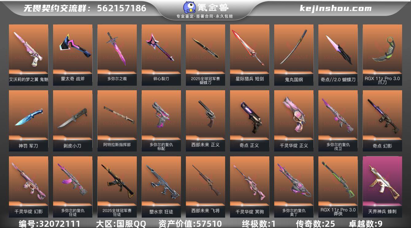 段位: 铂金 套装: 2025全球冠军赛,多弥尔的复仇 近战武器皮肤: 军刀-神罚,剥皮小刀-异形猎人,爪刀-RGX 11z Pro 3.0,蝴蝶刀-奇点//2.0,鬼丸国纲-般若假面//2.0,阿特拉斯指挥部,星际猎兵 短剑,2025全球冠军赛 蝴蝶刀,多弥尔之裁,碎心裂刃,蒙太奇 战斧 步枪皮肤: 幻影-奇点,狂徒-紫阙金琅,狂徒-盖亚的复仇,戍卫-天界神兵,狂徒-塑水宗,幻影-千灵华绽,獠犬-日冕雄师,狂徒-掠影,幻影-神中神罚,2025全球冠军赛 狂徒,多弥尔的复仇 狂徒,多弥尔的复仇 戍卫,超集系统 狂徒,蒙太奇 幻影,风暴之子 戍卫 佩枪皮肤: 正义-奇点,正义-千灵华绽,鬼魅-艾沃莉的梦之翼,正义-西部未来,多弥尔的复仇 标配,超集系统 标配,风暴之子 正义,蒙太奇 狂怒 狙击枪皮肤: 冥驹-起源,冥驹-千灵华绽,莽侠-RGX 11z Pro 3.0,飞将-西部未来,风暴之子 冥驹,超集系统 飞将 冲锋枪皮肤: 蜂刺-天界神兵,蒙太奇 骇灵 霰弹枪皮肤: 雄鹿-起源,风暴之子 雄鹿 机枪皮肤: 多弥尔的复仇 奥丁,蒙太奇 战神 亮点: 【优质装备】:2025全球冠军赛,2025全球冠军赛 蝴蝶刀,多弥尔的复仇,正义-奇点,狂徒-塑水宗,幻影-千灵华绽,冥驹-千灵华绽,狂徒-掠影,幻影-奇点,狂徒-紫阙金琅,狂徒-盖亚的复仇,正义-千灵华绽,多弥尔的复仇 狂徒,多弥尔的复仇 戍卫,多弥尔的复仇 标配,多弥尔的复仇 奥丁,多弥尔之裁,军刀-神罚,冥驹-起源,戍卫-天界神兵,剥皮小刀,鬼魅-艾沃莉的梦之翼,爪刀-RGX 11z Pro 3.0,蝴蝶刀-奇点//2.0,鬼丸国纲,阿特拉斯指挥部,星际猎兵 短剑,雄鹿-起源,獠犬-日冕雄师,2025全球冠军赛 狂徒