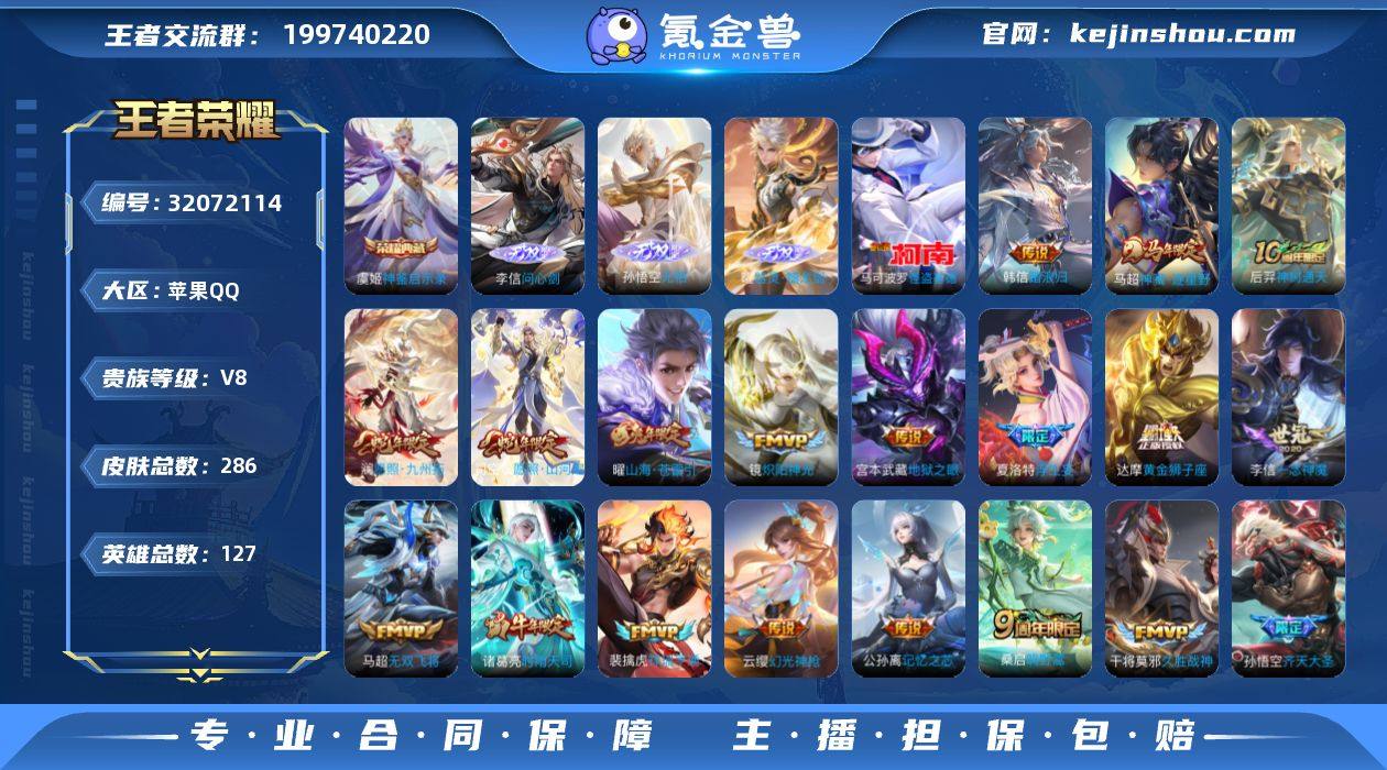 【王者荣耀】珍品无双0 典藏1 无双4 珍品传说1 传说28 史诗79 英雄127 皮肤286 贵族8级 荣耀典藏:神鉴启示录__无双皮肤:群星魔术团|器灵·螭龙剑|无相|问心剑__珍品传说:怪盗基德__传说皮肤:鸣野蒿|无双飞将|孙尚香-异界灵契|炽阳神光|启明星使|胖达荣荣|地狱之眼|久胜战神|黄金狮子座|狄仁杰-超时空战士|一念神魔|冠军飞将|乞巧织情|浮生妄|记忆之芯|齐天大圣|零号·赤焰|诗剑行|时雨天司|山海·苍雷引|幻光神枪|祥瑞亨通|愿照·山河定|愿照·九州拓|神树通天|花木兰-异界灵契|神骥·逐星野|踏浪归__稀有限定:至尊宝|大圣娶亲|蔷薇恋人|白鹤梁神女|孙行者|傲雪梅枪|李小龙|暗影游猎|超元猎域|大漠名商|高山流水|古海寻踪|海滩派对|海盐诗旅|皇家上将|辉光之辰|混沌棋|剑破天穹|江河有灵|金庭之子|黎明之约|迷踪丽影|魔术师|奇幻香踪|千军破阵|擒涛扼浪|青焰无极|驱傩正仪|荣光圣徽|沙漠行僧|探海日志|醍醐杖|天穹祈灯|玩趣恶龙|阿古朵-顽趣|万华元夜|妄想食味|无心|五谷丰年|演武夺筹|疑决卦|阴阳师|游园惊梦|原初追逐者|云间偶戏|暗隐猎兽者|缤纷独角兽|冰冠公主|冰雪圆舞曲|乘风破浪|大乔-猫狗日记|德古拉伯爵|地狱岩魂|电玩·爆裂旋风|功夫厨神|鬼剑武藏|黄金分割率|箭羽风息|节奏热浪|金属风暴|龙鼓争鸣|吕布-末日机甲|魅语|女仆咖啡|偶像歌手|赏金猎手|圣诞狂欢|水果甜心|水晶猎龙者|孙策-猫狗日记|晚萤|赵云-未来纪元|星夜王子|摇滚巨星|鹰眼统帅|幽灵船长|遇见神鹿|逐浪之夏|紫霞仙子|百里守约-百相守梦|老夫子-百相守梦|噬灭天穹|敬我三分|东方月初|埋骨钱|天穹之誓|怒海争锋|修罗|曙光守护者|心灵战警|心灵骇客|星界战将|谧流熔炉|化蝶舞|原初探秘者|云中旅人|刘禅-鸭鸭历险记|沈梦溪-鸭鸭历险记|龙之律动|布丁狗之约|虚灵犬护|石田雨龙|逆浪荇歌|孙策-百相守梦|周瑜-百相守梦|黄忠-百相守梦|涂山容容|荣光之誓...