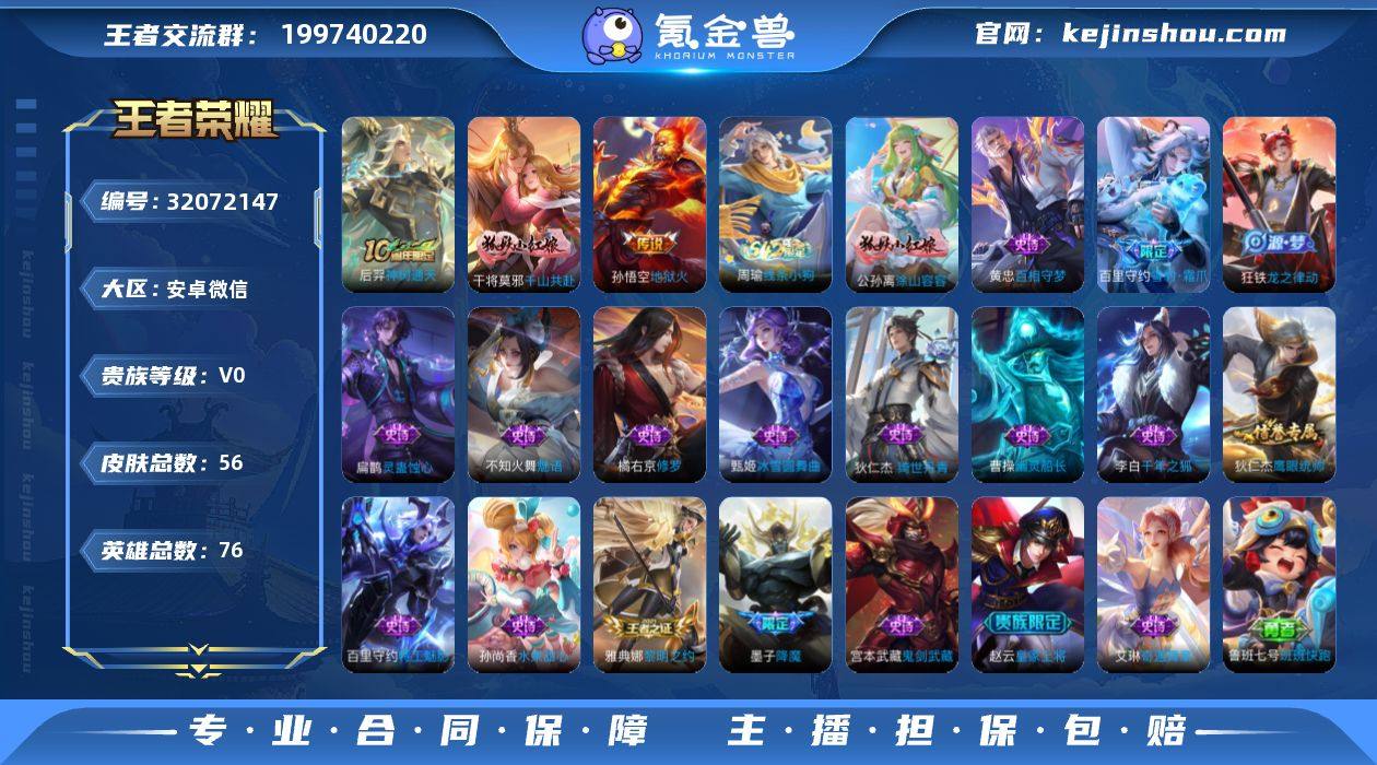 贵族等级:V0 典藏皮肤数:0 珍品无双皮肤数:0 无双皮肤数:0 珍品传说皮肤数:0 传说皮肤数:3 史诗皮肤数:19 皮肤数:56 英雄数:76 段位:荣耀王者