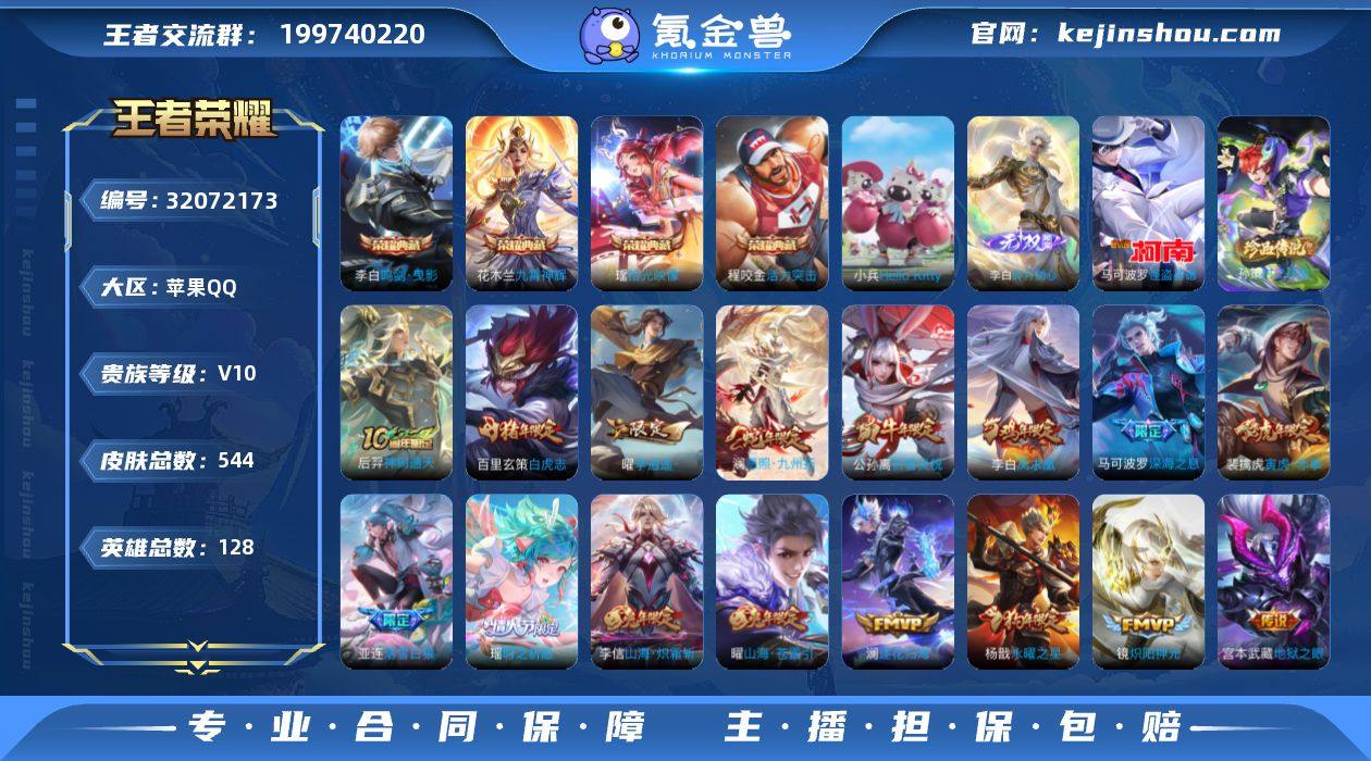 实名: 可修改 性别: 男号 贵族等级: V10 英雄数: 128 皮肤数: 544 荣耀水晶: 活力突击,鸣剑·曳影,九霄神辉,拾光映像 小兵皮肤: Hello Kitty 无双皮: 碎月剑心 珍品传说: 怪盗基德,时之奇旅-孙策 传说皮: 黄金狮子座,黄金射手座,云鹰飞将,绛天战甲,黄金白羊座,久胜战神,炽阳神光,一念神魔,云霓雀翎,末日机甲-孙尚香,地狱火,仲夏夜之梦,地狱之眼,胖达荣荣,李逍遥,时之恋人-刘备,淬星耀世,超时空战士-狄仁杰,无双飞将,神器·狴犴令,山海·炽霜斩,山海·琳琅生,山海·苍雷引,浮生妄,记忆之芯,百相守梦(张飞),电玩·雷克斯,妄想实况,鹤归松栖(云缨),遇见神鼓,大乔-时之奇旅,小动物乐团,霜月吟,澜逐花归海,艾琳觅芳踪,乘龙·铭钟鼎,落雪白狼,幻光神枪,祥瑞亨通,神树通天 限定皮: 冰锋战神,遇见飞天,李小龙,奔雷神使,祈雪灵祝,游园惊梦,梁祝,时雨天司,引擎之心,龙胆,武圣,烈魂,虎魄,神威,蜜橘之夏,永曜之星,飞衡,天狼狩猎者,天狼运算者,逐梦之星,逐梦之影,热情桑巴,凤求凰,寅虎·御盾,白虎志,青龙志,朱雀志,至尊宝,一生所爱,大圣娶亲,寅虎·瑞焰,霸王别姬-虞姬,高山流水,孙行者,匿光追影者,傲雪梅枪,寅虎·赤拳,寅虎·展翼,时之祈愿-瑶,补天,玉兔公主,启示之音,深海之息,前尘镜,枫霜尽,星穹之声,五谷丰年,绯月行,神器·万象笔,天降福星,诗剑行,怒海麟威,山海·玄木吟,冰霜神祇,山海·碧波行,齐天大圣,无限倾心-虞姬,无限倾心-项羽,鸣野蒿,逐霄战戟,愿照·九州拓 亮点: 【优质装备】:活力突击,鸣剑·曳影,九霄神辉(木兰典藏),碎月剑心(李白无双),拾光映像(瑶典藏),怪盗基德,黄金狮子座,黄金射手座,云鹰飞将(小将军),绛天战甲(鸡嘴战神),黄金白羊座,久胜战神,炽阳神光,一念神魔,云霓雀翎,末日机甲-孙尚香(绿蚂蚱),地狱火,仲夏夜之梦(大飞蛾),地狱之眼,胖达荣荣,李逍遥,时之恋人-刘备(电焊工),淬星耀世,超时空战士-狄仁杰,无双飞将,神器·狴...