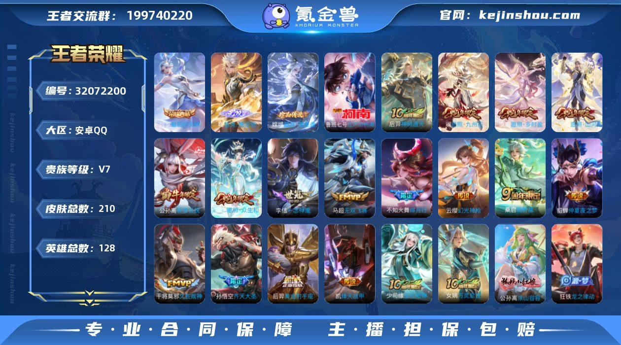 【王者荣耀】珍品无双0 典藏1 无双1 珍品传说3 传说16 史诗56 英雄128 皮肤210 贵族7级 荣耀典藏:最初的交响__无双皮肤:器灵·螭龙剑__珍品传说:江户川柯南|孙策-时之奇旅|器灵·落星盏__传说皮肤:鸣野蒿|无双飞将|绛天战甲|仲夏夜之梦|久胜战神|黄金射手座|一念神魔|绯月行|齐天大圣|祈雪灵祝|幻光神枪|愿照·岁时盈|愿照·山河定|愿照·九州拓|愿照·众生和|神树通天__稀有限定:寅虎·御盾|御风骁将|蜜橘之夏|神威|烈魂|猪悟能|山海·玄木吟|暗影游猎|冰锋战神|大漠名商|高山流水|海滩派对|海盐诗旅|幻夜卜梦|皇家上将|混沌棋|火炮绅士|剑破天穹|金庭之子|黎明之约|迷踪丽影|魔术师|千军破阵|驱傩正仪|沙漠行僧|朔风刀|醍醐杖|玩趣恶龙|万华元夜|五谷丰年|演武夺筹|疑决卦|阴阳师|优雅恋人|云间偶戏|暗夜贵公子|暗隐猎兽者|缤纷独角兽|苍穹之光|德古拉伯爵|功夫厨神|鬼剑武藏|箭羽风息|节奏热浪|金属风暴|魅力维加斯|偶像歌手|圣诞狂欢|圣诞恋歌|水果甜心|天才门将|天秀·音浪|赵云-未来纪元|星夜王子|摇滚巨星|鹰眼统帅|幽灵船长|逐浪之夏|百里守约-百相守梦|老夫子-百相守梦|噬灭天穹|修罗|心灵战警|特工魅影|心灵骇客|茶境仙|谧流熔炉|万物之道|器灵·浮梦炉|原初探秘者|云中旅人|访茗客|龙之律动|布丁狗之约|虚灵犬护|逆浪荇歌|黄忠-百相守梦|涂山容容|万灵启世|巫礼祀神|鹤鸣心笺|小乔-线条小狗|周瑜-线条小狗__优质皮肤:尼罗河女神|创世神祝|木偶奇遇记|未来旅行|激情绿茵|秩序猎龙将|冰刃幻境|英喵野望|维京掠夺者|启蛰|第七人偶|潮流仙人|芝加哥教父|绝影神枪|地府判官|幸存者|赤焰之缨|隐刃|特种部队|星航指挥官|龙域领主|爱与和平|蔷薇王座|灼热之刃|战争女神|加勒比小姐|修竹墨客|万圣前夜|功夫炙烤|潮玩探月行|秘密基地|次元突破|鲨炮海盗猫|野性能量|丁香结|科学大爆炸|守护之力|坚韧之力|功夫老勺|命运角斗...