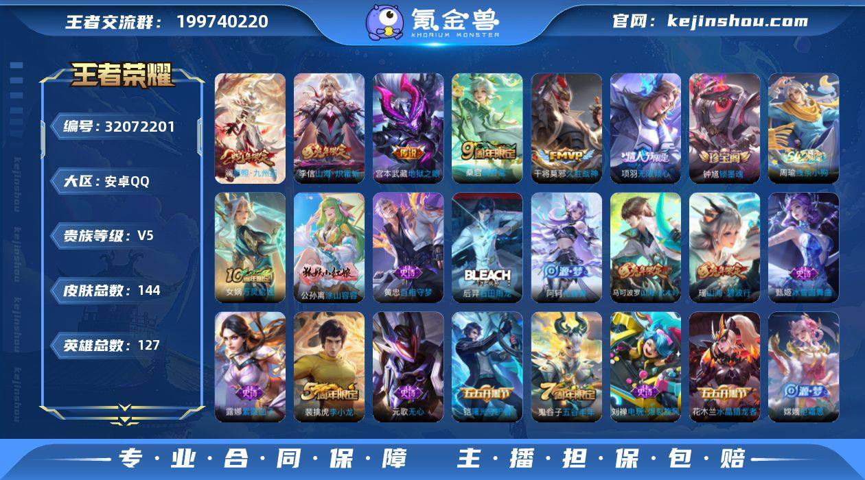 实名: 可修改 性别: 男号 贵族等级: V5 英雄数: 127 皮肤数: 144 传说皮: 久胜战神,地狱之眼,山海·炽霜斩 限定皮: 李小龙,五谷丰年,山海·玄木吟,山海·碧波行,无限倾心-项羽,鸣野蒿,愿照·九州拓 亮点: 【优质装备】:久胜战神,地狱之眼,山海·炽霜斩(李信年限),涂山容容