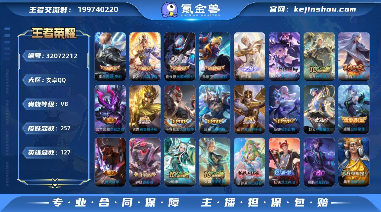 【王者荣耀】珍品无双0 典藏4 无双1 珍品传说1 传说11 史诗60 英雄127 皮肤257 贵族8级 荣耀典藏:无限飓风号|全息碎影|九霄神辉|鸣剑·曳影__无双皮肤:无相__珍品传说:酷洛米之心__传说皮肤:绛天战甲|启明星使|地狱之眼|久胜战神|黄金狮子座|黄金射手座|猫影幻舞|淬星耀世|凤求凰|怒海麟威|神树通天__稀有限定:青龙志|岱宗|蔷薇恋人|孙行者|猪悟能|拒霜思|大漠名商|电玩高手|古海寻踪|海滩派对|海盐诗旅|航海奇遇记|幻夜卜梦|皇家上将|混沌棋|剑破天穹|蓝屏警告|魔术师|匿光决锋者|奇幻香踪|千军破阵|擒涛扼浪|驱傩正仪|朔风刀|探海日志|饕餮|天穹祈灯|万华元夜|无心|五谷丰年|午后时光|纤云弄巧|夜都怪侠|疑决卦|阴阳师|真爱魔法|暗夜猫娘|暗隐猎兽者|白蛇|冰冠公主|冰雪圆舞曲|苍穹之光|乘风破浪|德古拉伯爵|地狱岩魂|电玩小子|功夫厨神|鬼剑武藏|吕布-末日机甲|梦奇-顽趣|女仆咖啡|偶像歌手|圣诞狂欢|圣诞恋歌|水果甜心|孙策-猫狗日记|天才门将|赵云-未来纪元|星夜王子|鹰眼统帅|永昼|幽灵船长|钟无艳-超时空战士|逐浪之夏|紫霞仙子|修罗|曙光守护者|心灵战警|千年之狐|特工魅影|谧流熔炉|器灵·浮梦炉|狰|原初探秘者|重明|云中旅人|孙悟空-神迹守卫|圣弓游侠|墨子-神迹守卫|落雪兰心|死神来了|灵蛊蚀心|龙之律动|布丁狗之约|虚灵犬护|涂山容容|荣光之誓|万灵启世|巫礼祀神|鹤鸣心笺|小乔-线条小狗|周瑜-线条小狗|锁墨魂__优质皮肤:尼罗河女神|一千零一夜|创世神祝|年年有余|埃及法老|孤猎|木偶奇遇记|熊喵少女|午夜歌剧院|露花倒影|未来旅行|激情绿茵|海之征途|天启骑士|碧珀绯影|秩序猎龙将|锦衣卫|冰刃幻境|森|超能战警|英喵野望|维京掠夺者|踏雪寻梅|启蛰|战争骑士|伊势巫女|生化警戒|威尼斯狂欢|第七人偶|潮流仙人|街头旋风|绝影神枪|幸存者|赤焰之缨|福禄兄弟|前尘|特种部队|三太子|精灵王|范海辛|星航指挥...