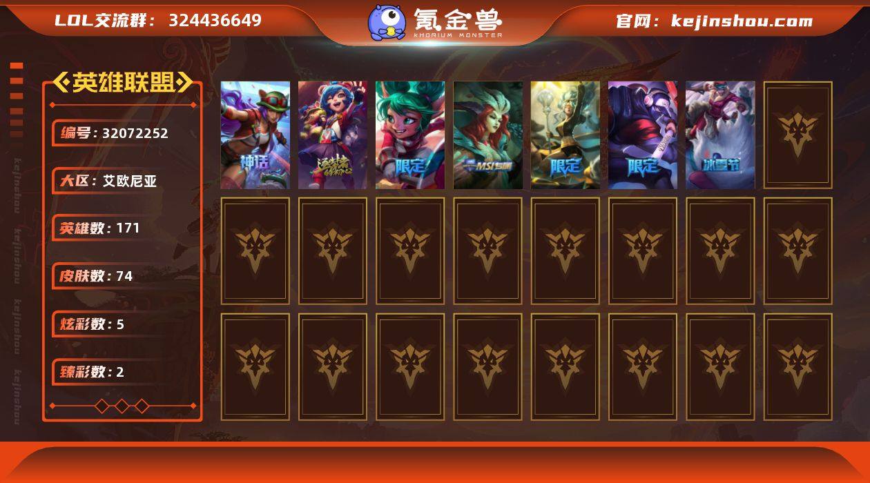 等级:168 英雄数:171 皮肤数:74 终极皮肤数量:0 神话皮肤数量:2 限定皮肤数量:5 传说皮肤数量:5 史诗皮肤数量:20 炫彩数量:5 臻彩总数量:2 钻石臻彩数量:0 神话精粹:34 橙色精粹:5394 海克斯钥匙:10 海克斯宝箱:1 海克斯钥匙碎片:2 神话皮肤:十周年纪念安妮