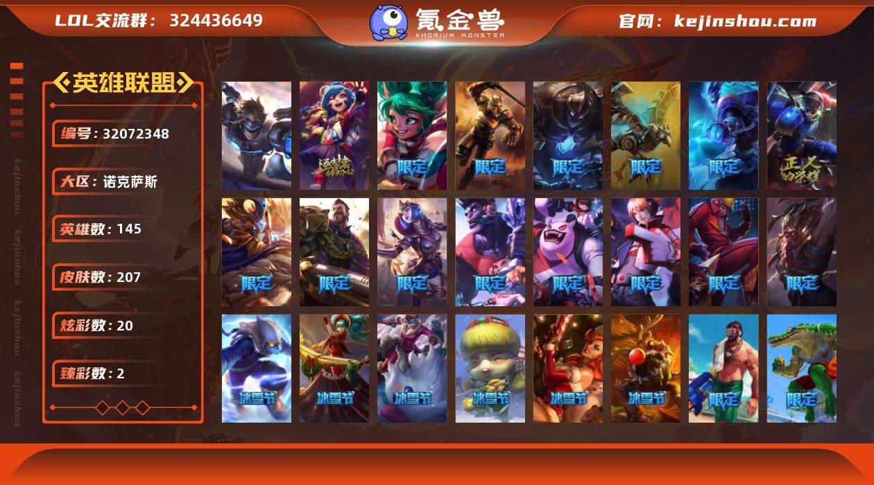 等级:169 英雄数:145 皮肤数:207 终极皮肤数量:1 神话皮肤数量:2 限定皮肤数量:26 传说皮肤数量:16 史诗皮肤数量:64 炫彩数量:20 臻彩总数量:2 钻石臻彩数量:0 神话精粹:8 橙色精粹:7638 海克斯钥匙:0 海克斯宝箱:32 海克斯钥匙碎片:2 神话皮肤:十周年纪念