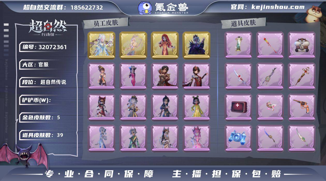 红色皮肤数量:0 金色皮肤数量:5 紫色皮肤数量:13 道具皮肤数量:39 瑶台梦,莲华渡,镜花辞,渡鸦公爵 卖家说:急出可刀