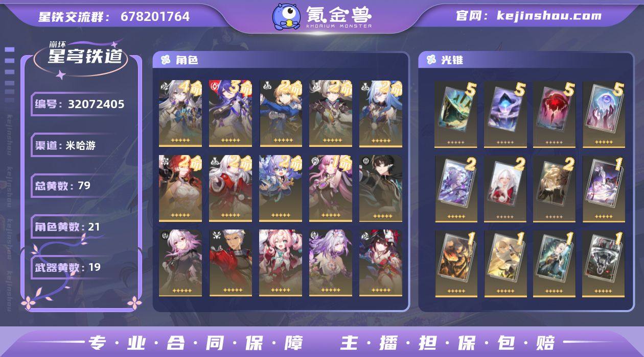 【崩坏·星穹铁道】冒险等级:70,女主,五星数量:40,五星角色:布洛妮娅 * 4命,黄泉 * 3命,白露 * 2命,姬子 * 2命,克拉拉 * 2命,镜流 * 2命,Saber * 2命,流萤 * 2命,符玄 * 1命,银狼,希儿,瓦尔特,罗刹,刃,遐蝶,真理医生,花火,风堇,Archer,长夜月,丹恒·腾荒__五星光锥:星海巡航 * 5精,记忆的质料 * 5精,记一位星神的陨落 * 5精,记忆永不落幕 * 5精,无可取代的东西 * 2精,如泥酣眠 * 2精,让告别,更美一些 * 2精,制胜的瞬间,制胜的瞬间,以世界之名,时节不居,此身为剑,镜中故我,行于流逝的岸,理想燃烧的地狱,没有回报的加冕,致长夜的星光,致长夜的星光,梦应归于何处__四星角色:娜塔莎 * 6命,虎克 * 6命,黑塔 * 6命,丹恒 * 6命,艾丝妲 * 6命,希露瓦 * 6命,停云 * 6命,桑博 * 6命,三月七 * 6命,青雀 * 6命,佩拉 * 6命,驭空 * 6命,玲可 * 6命,寒鸦 * 6命,雪衣 * 6命,米沙 * 6命,加拉赫 * 6命,素裳 * 5命,卢卡 * 4命,阿兰 * 3命,桂乃芬 * 2命,貊泽