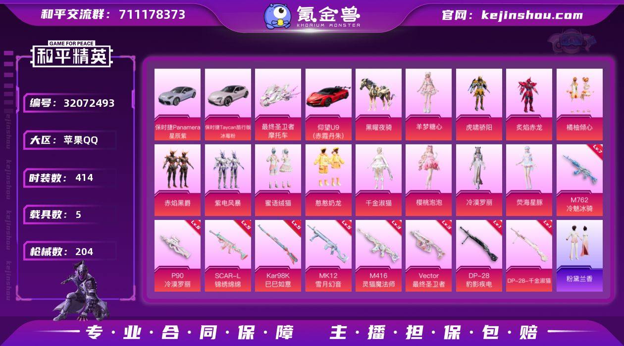 实名: 可修改 时装数: 414 载具数: 5 枪械数: 204 战备数: 5 热门装扮: 梦魇先生,东方飞龙,炙焰赤龙,虎啸骄阳,紫电风暴,赤焰黑爵,橘柚倾心,憨憨奶龙,蜜语绒猫,千金淑猫,樱桃泡泡,冷漠罗丽,荧海星豚,羊梦糖心 载具: 仰望U9(赤霞丹朱),最终圣卫者摩托车,黑曜夜骑,保时捷Panamera(星辰紫),保时捷Taycan旅行版(冰莓粉) 稀有枪皮: M762冷魅冰骑,SCAR-L-锦绣绵绵,DP-28-千金淑猫,Kar98K-巳巳如意,MK12-雪月幻音,Vector-最终圣卫者,P90-冷漠罗丽,M416-灵猫魔法师,DP-28-豹影疾电 亮点: 【优质装备】:Mark.06(新蓝螳螂),七级M762-冷魅冰骑