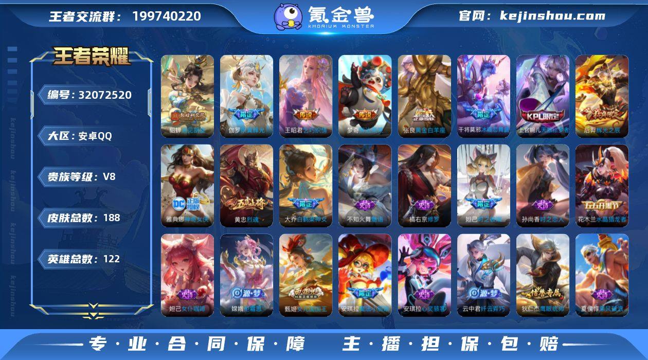 V8 10传说 122英雄 188皮肤 可修改实名 男号 【稀有英雄】嬴政(始皇帝),韩信(韩跳跳),夏洛特(夏师傅),艾琳,橘右京(橘子),娜可露露(鸟人),不知火舞,赵云,金蝉(唐僧),戈娅 【传说皮】神树通天,遇见胡旋,黄金白羊座,胖达荣荣,乞巧织情,末日机甲-孙策,炽翼辉光(娃娃菜牛角包) 【珍宝阁皮】蔷薇恋人 【赛季/战令皮】海盐诗旅(s30),擒涛扼浪(s31),探海日志(s32),御銮(s16),朔风刀(s17),混沌棋(s18),疑决卦(s19),醍醐杖(s20),原初探秘者(s21),万华元夜(s22),演武夺筹(s23),驱傩正仪(s24),千军破阵(s25),白昼王子,赤莲之焰,驯魔猎人,星空之诺,银河之约,夺宝奇兵,迷踪丽影,西部大镖客-猪八戒,暗影游猎(游乐娃子),单词大作战,狂想玩偶喵,潮玩骑士王,云间偶戏,星际陆战队-达摩,胡桃异想国,神迹守卫-墨子,航海奇遇记,火炮绅士,沙漠行僧(s26),幻夜卜梦,吟游魔法,夜都怪侠,金庭之子(s27),大漠名商(s28),云中旅人(s29) 【史诗皮】黄金分割率,冰冠公主,偶像歌手,魅语,末日机甲-吕布,猫狗日记-孙策,时之恋人-孙尚香,修罗,女仆咖啡,摇滚巨星,水果甜心,天才门将,星夜王子,心灵骇客,功夫厨神,德古拉伯爵,鬼剑武藏,心灵战警,舞动绿茵,纤云弄巧,繁星吟游(呼啦呼啦),拒霜思,缤纷独角兽,乘风破浪,逐浪之夏,水晶猎龙者,箭羽风息,金属风暴,圣诞恋歌,鹰眼统帅,魅力维加斯,赏金猎手,寅虎·御盾,未来纪元-赵云 【限定皮】时之彼端,白鹤梁神女,魔法小厨娘,时雨天司(水龙头),五谷丰年,幽恒(沐浴露),天狼运算者,梁祝,逐梦之星,烈魂,天狼溯光者,天狼征服者,奔雷神使(牛魔年限),天狼绘梦者,李小龙,逐梦之光,辉光之辰,如梦令-后羿,霸王别姬-虞姬,冰霜恋舞曲,云端筑梦师,乒乒小将,神奇女侠,女儿国国王,寅虎·御盾(廉颇年限),寅虎·瑞焰(虎皮蛋子) 【普通皮】神迹守卫,刘邦虎啸剑宗,街头霸王,鹤鸣心笺,尼罗河女神,蔚蓝守将,万事如意,五福同心,龙腾
