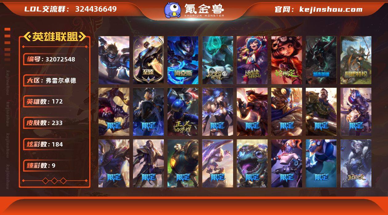 等级:689 英雄数:172 皮肤数:233 终极皮肤数量:1 神话皮肤数量:5 限定皮肤数量:27 传说皮肤数量:18 史诗皮肤数量:57 炫彩数量:184 臻彩总数量:9 钻石臻彩数量:0 神话精粹:36 橙色精粹:8240 海克斯钥匙:1 海克斯宝箱:0 海克斯钥匙碎片:2 神话皮肤:十周年纪