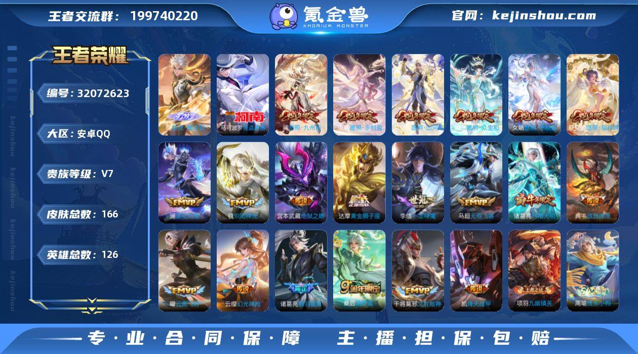实名: 可修改 性别: 女号 贵族等级: V7 英雄数: 126 皮肤数: 166 无双皮: 器灵·螭龙剑 珍品传说: 怪盗基德 传说皮: 黄金狮子座,云鹰飞将,绛天战甲,久胜战神,炽阳神光,一念神魔,地狱之眼,无双飞将,鹤羽星尊,澜逐花归海,典韦战鼓燎原,幻光神枪 限定皮: 时雨天司,引擎之心,至尊宝,傲雪梅枪,鸣野蒿,逐霄战戟,愿照·千秋盛,愿照·众生和,愿照·山河定,愿照·岁时盈,愿照·福禄聚,愿照·九州拓 亮点: 【优质装备】:器灵·螭龙剑,怪盗基德,黄金狮子座,云鹰飞将(小将军),绛天战甲(鸡嘴战神),久胜战神,炽阳神光,一念神魔,地狱之眼,无双飞将,鹤羽星尊,澜逐花归海,涂山容容