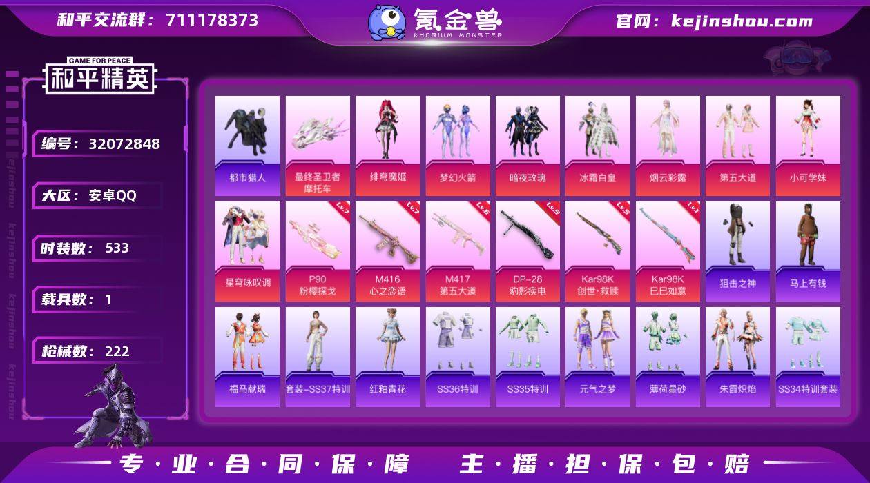 实名:可二次实名 是否支持人脸包赔:支持 粉装数量:8 特效枪数量:6 载具数:1 时装数:533 枪械数:222 都市猎人 暗夜玫瑰,冰霜白皇,第五大道,绯穹魔姬,梦幻火箭,小可学妹,星穹咏叹调,烟云彩露 七级M416-心之恋语,七级P90-粉樱探戈,六级M417-第五大道,五级DP-28-豹影疾电,五级Kar98K-创世·救赎,一级Kar98K-巳巳如意 最终圣卫者摩托车 狙击之神,马上有钱,福马献瑞,红釉青花,SS37特训,雨过天青,SS36特训,SS35特训,元气之梦,薄荷星砂,凌霄紫焰,SS34特训套装,朱霞炽焰,Alan Walker,暗影哥特,冰冻风暴,缤纷果语,滨海假日,冰河战士,白色伏地魔,贝斯之夜,白熊同盟,春光漫游,彩虹兔,雏菊兔兔,长空猛禽,纯真浪花,大橘大利,呆萌铁蟹,都市猎人,都市漫游者,蝶吟花词,飞驰魅影,风玲,绯格组合,福星高照,飞行日记,龟仙人,光之冒险,幻彩翩翩,鹤鸣,活力之心,怀庆长公主,黄色伏地魔,黄色运动,幻世战舞者,幻羽潜行,幻影武者,极地朋克,惊鸿侠骨,娇憨猪猪,竞技名士,吉莉礼服,锦衣飞扬,酷潮明星,空岛之星,快乐星愿,快闪甜心,蓝彩潮人,龙的传人,龙魂突击队,萝兰蝴蝶,浪漫天命,蓝色运动,龙腾端午,莱茵河畔,Mark.06,漫步者,妙红点点,萌黄之夏,魅力单车,蜜露汐语,懵萌河马,萌趣咩咩,冥星暗影,明鸳圣池,弄潮海豚,霓虹街区,怒火燎原,柠萌假日,牛气冲天,牛气满满,青春校园,轻风白浪,青涩时光,云朵鹅,荣耀,热情海星,热血青春,忍者信条,神气柴柴,SS14特训,SS15特训,SS16特训,SS17特训,SS18特训,SS19特训,SS20特训,SS21特训,SS22特训,SS23特训,SS24特训,SS25特训,SS26特训,SS27特训,SS28特训,SS29特训,SS31特训套装,SS32特训套装,SS33特训套装,巳巳如意,探宝勇士,涂山之恋,甜心亚梦,田园牧歌,王牌教练,迅捷狂鲨,炫蓝之夏,星梦畅游,雪绒豹,夏日倾情,夏日音浪,血色贵族,香桃花海,星途旅人,香榭午后,虚音幻奏,熠彩粉晶,音速流光,玉兔迎春,乐音,野性战心,鹰眼刺客,焰鹰斗篷,耀眼新星,智谋强哥 灵珠游龙飞行器,深海曼妙飞行器,炫彩糖果降落伞,彩虹甜喵降落伞,第五大道降落伞,幻彩电音降落伞,金丰海韵降落伞,精灵梦叶罗丽降落伞,冷漠罗丽降落伞,灵猫魔法师降落伞,时光之誓降落伞,圣堂之誓降落伞,童趣迷兔降落伞,炫光之旅降落伞,音爆索尼克降落伞,仲夏莫吉托降落伞,猪猪侠降落伞 卖家说:连着火影号