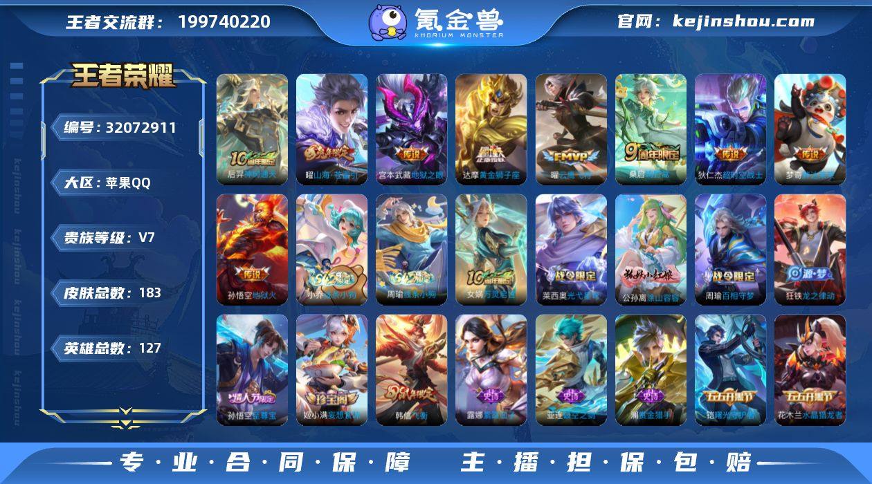 实名: 可修改 性别: 男号 贵族等级: V7 英雄数: 127 皮肤数: 183 传说皮: 黄金狮子座,云鹰飞将,地狱火,地狱之眼,胖达荣荣,超时空战士-狄仁杰,山海·苍雷引,神树通天 限定皮: 飞衡,逐梦之影,至尊宝,霸王别姬-虞姬,鸣野蒿 亮点: 【优质装备】:黄金狮子座,云鹰飞将(小将军),地狱火,地狱之眼,胖达荣荣,超时空战士-狄仁杰,山海·苍雷引(电光曜子),涂山容容