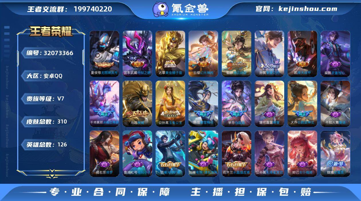 V7 1典藏 13传说 126英雄 310皮肤 可修改实名 男号 【英雄全皮】敖隐全皮,蚩奼全皮,刘邦全皮 【稀有英雄】敖隐(小龙人),大司命,韩信(韩跳跳),夏洛特(夏师傅),艾琳,橘右京(橘子),娜可露露(鸟人),不知火舞,赵云,金蝉(唐僧),戈娅 【荣耀水晶】无限飓风号(高达) 【传说皮】幻光神枪,神树通天,遇见胡旋,黄金狮子座,地狱之眼,绛天战甲(鸡嘴战神),末日机甲-孙策,挚爱之约 【珍宝阁皮】妄想食味,万物之道,蔷薇恋人,女武神 【赛季/战令皮】噬灭天穹(s37),古海寻踪(s33),海盐诗旅(s30),擒涛扼浪(s31),探海日志(s32),顽趣-梦奇,剑破天穹(s35),天穹祈灯(s34),天穹之誓(s36),凯尔特女王(s7),狰(s8),饕餮(s9),烛龙(s10),重明(s11),穷奇(s12),御狮(s13),御霄(s14),御旌(s15),御銮(s16),朔风刀(s17),混沌棋(s18),疑决卦(s19),醍醐杖(s20),原初探秘者(s21),万华元夜(s22),演武夺筹(s23),驱傩正仪(s24),千军破阵(s25),猎兽之王,白昼王子,朔望之晖,蓝屏警告,神迹守卫-钟馗,狮舞东方,赤莲之焰,驯魔猎人,星空之诺,银河之约,夺宝奇兵,迷踪丽影,西部大镖客-猪八戒,暗影游猎(游乐娃子),单词大作战,狂想玩偶喵,潮玩骑士王,云间偶戏,星际陆战队-达摩,胡桃异想国,神迹守卫-墨子,航海奇遇记,圣弓游侠,真爱魔法,火炮绅士,沙漠行僧(s26),幻夜卜梦,金庭之子(s27),大漠名商(s28),云中旅人(s29) 【史诗皮】星界战将,战舞者,线条小狗-周瑜,涂山容容,罗小黑战记-百里玄策,灵蛊蚀心,紫霞仙子,苍穹之光,电玩小子(小书包),白龙吟,黄金分割率,特工魅影,千年之狐,江河有灵,蒙恬荣光圣徽,无限星赏官,冰冠公主,晚萤,魅语,电玩·爆裂旋风,末日机甲-吕布,猫狗日记-孙策,猫狗日记-大乔,乱世虎臣,节奏热浪,修罗,女仆咖啡,摇滚巨星,水果甜心,绅士熊喵,天才门将,星夜王子,心灵骇客,时之奇旅-安琪拉