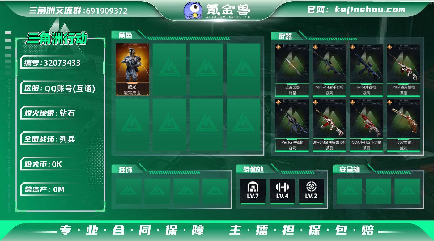 实名: 可修改 烽火地带段位: 钻石 全面战场段位: 列兵 总资产: 68 哈夫币: 4 干员外观: 威龙-凌霄戍卫 传说武器皮肤: AK-12突击步枪-夜鹰,SCAR-H战斗步枪-启航,近战-暗星,M14射手步枪-蛮荒,QBZ95-1突击步枪-凌霄戍卫,K416突击步枪-行动记录,SCAR-H战斗步枪-荼蘼,PKM通用机枪-荼蘼,SR-3M紧凑突击步枪-荼蘼,Vector冲锋枪-夜莺,MK4冲锋枪-夜莺,Mini-14射手步枪-夜莺,.357左轮-缄花,SR-25射手步枪-缄花,M14射手步枪-缄花