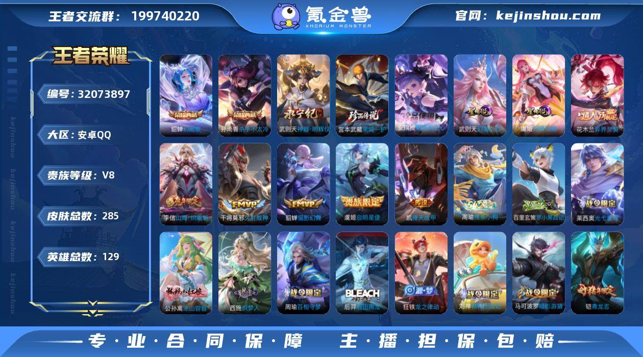 【秒换绑】安卓Q-V8-至尊星耀IV段位-129英雄-285皮肤-2典藏皮肤-1典藏英雄-1无双-2珍品传说-6传说-62史诗 【英雄全皮】:猪八戒全皮,空空儿全皮,影全皮 【荣耀典藏】:武则天英雄,孙尚香杀手不太冷,貂蝉幻阙歌 【无双皮肤】:武则天神器明辉仪 【珍品传说】:宫本武藏黑崎一护,安琪拉酷洛米之心 【传说皮肤】:花木兰异界灵契,李信山海炽霜斩,铠绛天战甲,虞姬启明星使,貂蝉猫影幻舞,干将莫邪久胜战神 【限定皮肤】:白起狰,狄仁杰阴阳师,虞姬凯尔特女王,赵云皇家上将,嬴政优雅恋人,嬴政白昼王子,鲁班七号狮舞东方,庄周蜃楼王,庄周高山流水,孙膑妖精王,扁鹊炼金王,白起夜都怪侠,芈月重明,吕布猎兽之王,元歌云间偶戏,夏侯惇朔风刀,甄姬游园惊梦,曹操烛龙,典韦穷奇,马可波罗暗影游猎,马可波罗山海玄木吟,狄仁杰魔术师,狄仁杰万华元夜,达摩沙漠行僧,项羽海滩派对,老夫子醍醐杖,关羽冰锋战神,程咬金演武夺筹,兰陵王金庭之子,亚瑟狮心王,牛魔御旌,李元芳云中旅人,虞姬启明星使,钟馗神迹守卫,钟馗驱傩正仪,杨玉环遇见飞天,太乙真人饕餮,鬼谷子原初探秘者,鬼谷子五谷丰年,铠青龙志,苏烈千军破阵,百里守约朱雀志,弈星混沌棋,沈梦溪大漠名商,明世隐疑决卦,裴擒虎李小龙,裴擒虎擒涛扼浪,狂铁御狮,米莱狄御霄,瑶山海碧波行,李信山海炽霜斩,盾山御銮,猪八戒西部大镖客,猪八戒猪悟能,嫦娥如梦令,嫦娥拒霜思,嫦娥暖冬兔眠,鲁班大师探海日志,桑启海盐诗旅,戈娅驭风魔法,艾琳女武神,张良古海寻踪,鬼谷子天穹祈灯,沈梦溪龙舞盛年,鲁班七号蔬乡物语,刘邦剑破天穹,镜青焰无极 【年限皮肤】:百里守约朱雀志,铠青龙志,李信山海炽霜斩,瑶山海碧波行,马可波罗山海玄木吟 【赛季限定】:亚瑟狮心王,庄周蜃楼王,孙膑妖精王,扁鹊炼金王,虞姬凯尔特女王...