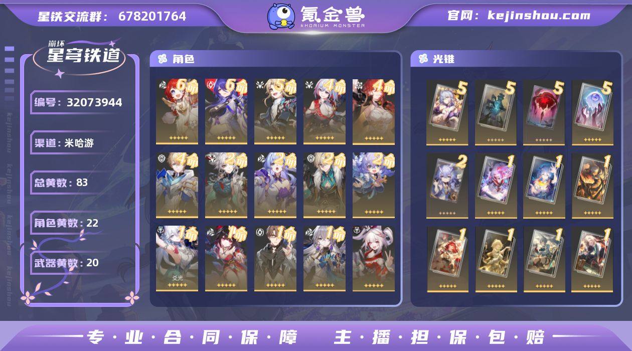 总黄数:83 五星光锥数:20 五星角色数:22 开拓等级:70 开拓者性别:女 星轨专票:651 梦华数量:620 星琼数量:266 6命缇宝,6命黄泉,5命彦卿,4命托帕&账账,4命姬子,4命杰帕德,2命飞霄,2命知更鸟,2命砂金,2命白露,1命爻光,1命花火,1命瓦尔特,1命布洛妮娅,0命火花,0命丹恒·腾荒,0命Archer,0命椒丘,0命真理医生,0命阮·梅,0命刃,0命克拉拉 5精夜色流光溢彩,5精孤独的疗愈,5精记一位星神的陨落,5精记忆永不落幕,2精时节不居,1精花花世界迷人眼,1精当她决定看见,1精理想燃烧的地狱,1精如果时间是一朵花,1精将光阴织成黄金,1精我将,巡征追猎,1精命运从未公平,1精行于流逝的岸,1精游戏尘寰,1精银河铁道之夜,1精无可取代的东西,1精如泥酣眠,1精记忆的质料,1精星海巡航 换绑材料:可提供换绑材料 邮箱状态:未绑定 psn绑定情况:否 taptap绑定情况:否 卖家说:11爻光01火花三队配置屯屯带655抽专票。战利品差600没收集。保底700抽大小月卡已开有当期月卡头像