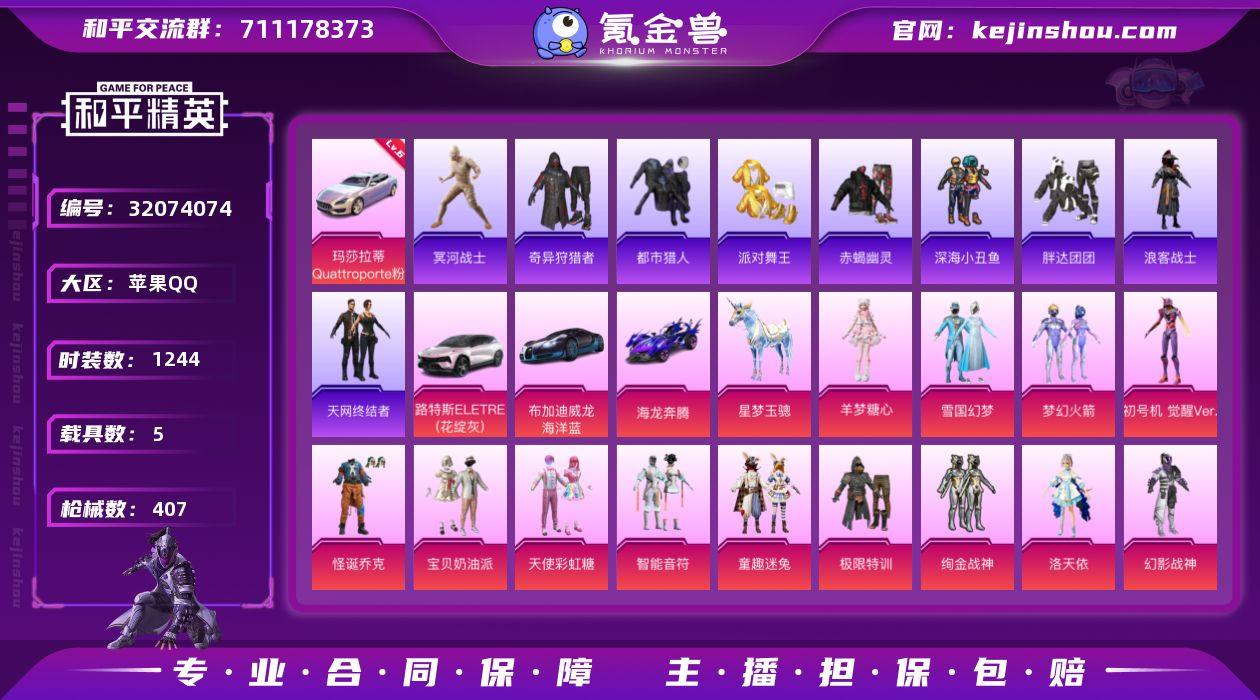 【特价出售】禁头像到3.1苹果Q-14稀有5载具22粉装24特效枪39热门317套装407枪皮 149536热力值 23印记 历史无敌战神 【14稀有】 木乃伊 奇异狩猎者 S1赛事外套 赤蝎幽灵 M416-黄金龙骨 AWM-黄金龙骨 M416-星际漫游 AKM-缤纷海域 AKM-百万伏特 都市猎人 浪漫天命 派对舞王 天网终结者 派对舞王(金靴子) 【5载具】 玛莎拉蒂Q幻星粉 (6级) 布加迪威龙(海洋蓝) 路特斯EL灰色 海龙奔腾 星梦玉骢 【22粉装】 觉醒初号机 梦幻火箭 雪国幻梦 宝贝奶油派 天使彩虹糖 千金淑猫 洛天依 未来歌姬 怪诞乔克 羊梦糖心 幻影战神 霓裳武神 垂柳戏鸭 智能音符 快乐主宰 极限特训 麻辣鲜香锅 绚金战神 童趣迷兔 冰霜白皇 炙焰红王 星之彼岸 【24特效枪】 SCAR-L-梦幻火箭 (1级) M416-五爪金龙 (5级) M416-心之恋语 (1级) AKM-甜心宝贝 (7级) AKS-74U-森灵之息 (5级) Kar98K-巳巳如意 (5级) DP-28-豹影疾电 (5级) AUG-星梦奇缘 (6级) 蜜獾-异瞳寒姬 (6级) SCAR-L-童趣迷兔 (7级) AUG-星之彼岸 (1级) UMP45-相思残雪 (5级) Kar98K-创世救赎 (3级) M416-至情至圣 (9级) AKM-梦之光华 (1级) DP-28-暗夜鎏金 (4级) MG3-洛神天依 (5级) AKS-74U-森灵之息 (5级) Mk14-福马献瑞 (5级) ACE32-萌骑漫游 (1级) Vector-环太平洋 (6级) 燃烧瓶-薄荷可可 (6级) 烟雾弹-好运连连 (3级) 破片手榴弹-秋玉花灯 (7级) 【39热门】 8号机 Mark.06 小丑鱼 龟仙人 暗夜之虎 浪漫假日 雪山精英 东方飞龙 动感兔斯基 呆萌铁蟹 万圣娃娃 鹰眼刺客 兔兔白日梦 暗夜行者 暗夜之虎 深海小丑鱼 浪客战士 胖达团团 TT战队服 裁决冥王 暗夜契约 怪笑疯兔 暗影哥特 团圆交子 瑞龙福将 粉红小猪 忍者信条 水银刺客 狂沙舞者 漫步者 破蛋小黄鸡 软嫩糖心蛋 黑色刀锋 军刀雅典娜 英勇保护者 弄潮海豚 M762-瑞龙福将 M24-奇异狩猎者 S686-奇异狩猎者 【3飞行器】 梦幻火箭...
