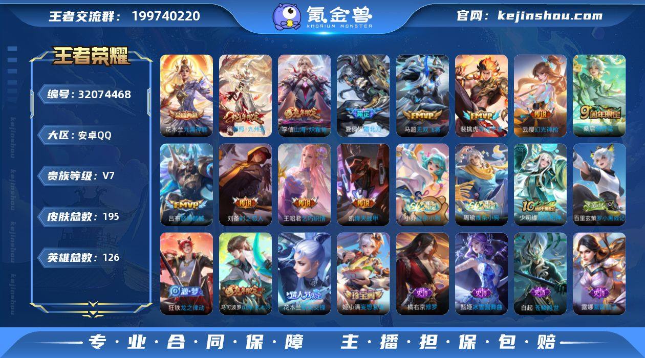 安卓Q-V7-至尊星耀IV段位-126英雄-195皮肤-1典藏皮肤-11传说-54史诗HZ263503 【英雄全皮】:影全皮 【荣耀典藏】:花木兰九霄神辉 【传说皮肤】:澜愿照九州拓,云缨幻光神枪,裴擒虎祥瑞亨通,桑启鸣野蒿,夏侯惇霜北刀,李信山海炽霜斩,吕布怒海麟威,马超无双飞将,王昭君乞巧织情,铠绛天战甲,刘备时之恋人 【限定皮肤】:夏侯惇霜北刀,蒙犽顽岩魄,姜子牙天穹之誓,李白谪仙醉月,狄仁杰阴阳师,赵云皇家上将,墨子神迹守卫,高渐离玩趣恶龙,芈月幻夜卜梦,元歌无心,夏侯惇朔风刀,马可波罗山海玄木吟,狄仁杰魔术师,狄仁杰万华元夜,达摩沙漠行僧,项羽海滩派对,老夫子醍醐杖,老夫子航海奇遇记,程咬金演武夺筹,兰陵王金庭之子,花木兰默契交锋,李元芳云中旅人,钟馗驱傩正仪,干将莫邪胡桃夹子,鬼谷子原初探秘者,黄忠火炮绅士,苏烈千军破阵,弈星混沌棋,沈梦溪大漠名商,明世隐疑决卦,裴擒虎李小龙,裴擒虎擒涛扼浪,云中君纤云弄巧,李信山海炽霜斩,上官婉儿梁祝,嫦娥拒霜思,鲁班大师探海日志,桑启海盐诗旅,阿古朵江河有灵,张良古海寻踪,蒙犽百解令,鬼谷子天穹祈灯,姬小满妄想食味,沈梦溪龙舞盛年,刘邦剑破天穹,程咬金群星魔术团,刘备异域游侠,周瑜熔金海岸 【年限皮肤】:李信山海炽霜斩,马可波罗山海玄木吟,澜愿照九州拓 【赛季限定】:夏侯惇朔风刀,弈星混沌棋,明世隐疑决卦,老夫子醍醐杖,鬼谷子原初探秘者,狄仁杰万华元夜,程咬金演武夺筹,钟馗驱傩正仪,苏烈千军破阵,达摩沙漠行僧,兰陵王金庭之子,沈梦溪大漠名商,李元芳云中旅人,桑启海盐诗旅,裴擒虎擒涛扼浪,鲁班大师探海日志,张良古海寻踪,鬼谷子天穹祈灯,刘邦剑破天穹,姜子牙天穹之誓 【战令限定】:老夫子航海奇遇记,墨子神迹守卫,黄忠火炮绅士,芈月幻夜卜梦,周瑜线条小狗,小乔线条小狗...