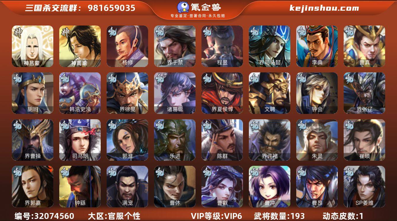 VIP等级:VIP6 官阶:中军将军 史诗武将数量:11 动态皮肤数量:1 宝珠数量:0 元宝数量:404 将魂数量:378 雁翎数量:9632 心愿积分数量:2959 欢乐豆数量:66365 金票数量:202 卖家说:11史诗双神中军,6.6万豆,玉龙回廊动态大宝界徐盛,星甘宁,周处,花鬘,张星彩,董允,界于禁,贺齐,左慈,杨修,程昱11史诗,神周瑜,神吕蒙,金皮谋韩当,陈震,崔琰,关银屏,sp庞统,sp赵云,界孙休,谋高顺,界朱治,界曹植,胡班,吴班,张布,孙翊,张翼,濮阳兴,诸葛恪,凌操,贾充,界孙鲁班,荀谌193将,国战62将,满级活树