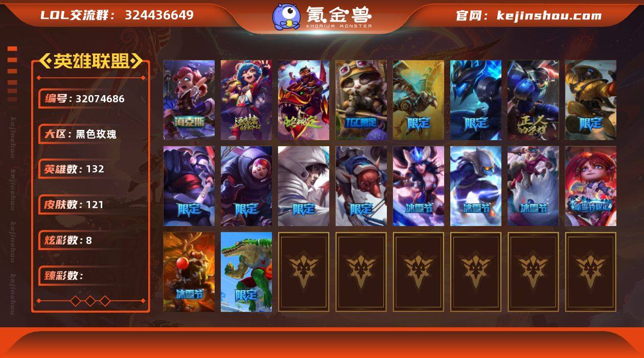 【LOLZ1293】132英雄/121皮肤/3神话/19限定/8炫彩/15传说/27史诗/未定级/10周年 安妮/10周年庆典 凤凰/海克斯 安妮/神龙之翼 库奇/冰雪风暴 希维尔/英勇玩具兵船长/圣诞玩偶 波比/圣诞老人 酒桶/圣诞驯鹿 克格莫/魄罗骑士 瑟庄妮/冰雪节 马尔扎哈/卧虎藏龙 贾克斯/冠军之矛 卡莉丝塔/S2 暗杀星 慎/S3 SKT T1 贾克斯/S4 SSW 图奇/S4 SSW 泰隆/海贼 瑞兹/泳池派对 雷克顿/密林猎手 提莫/钢铁之翼 艾尼维亚/防暴天使 凯尔/源计划:林 易/女皇 艾希/冰霜之刃 艾瑞莉娅/红色男爵 库奇/神拳 李青/源计划:净化 薇恩/神王 盖伦/黎明使者 锐雯/女校长 菲奥娜/霸天异形 卡兹克/灌篮高手 德莱厄斯/神王 德莱厄斯/黑夜使者 亚索/神龙尊者 昼日真龙 亚索/天煞 劫/安伯斯与提妮/翼骑统领 赵信/月光女神阿忒弥斯 索拉卡/火箭达人 崔丝塔娜/荒野豺狼 沃里克/国王 泰达米尔/熔火之心 拉莫斯/战争血统 蒙多/铁血狙击手 凯特琳/符文战神 雷克顿/至高之拳 李青/深海妖姬 卡西奥佩娅/腥红之月 凯南/铁甲雄心 盖伦/腥红之月 泰隆/血色精锐 锐雯/兔女郎 锐雯/侏罗纪化石 克格莫/星际迷航 拉克丝/生化骑士 德莱厄斯/野火之藤 婕拉/西部牛仔 亚索/源计划: 风 亚索/源计划:雷 卢锡安/源计划:自由 艾克/星际之门 阿兹尔/暮星之羽 霞/创意工坊黑默丁格/亮丽女神希维尔/探戈灵魂崔斯特/潮流女王乐芙兰/社会名流乐芙兰/联合王国费德提克/末世天使凯尔/暗影易/玉剑传说无极/荒野镖客阿利斯塔/后场堡垒阿利斯塔/军情五处提莫/约德尔海贼团崔丝塔娜/冻原猎手沃里克/星之守护者厄运小姐/机械污染辛吉德/黑暗女王伊芙琳/王子不是我阿木木/恐怖之源萨科/小丑工作坊萨科/泳池派对 蒙多/先驱行者卡萨丁/日冕女神卡尔玛/白魔法师维迦/绿野仙踪维迦/铁锈斑斑布里茨/石破天惊墨菲特/赏金猎人卡特琳娜/哥特女仆奥莉安娜/战场BOSS布兰德/传统僧侣李青/独眼...