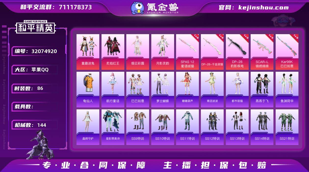 女生号-苹果手Q-4粉装-5特效枪-0载具-0粉色飞行器-40575热力值-4王牌印记-86套装-144枪皮 【热门品类】:粉装-童趣迷兔,套装-龟仙人 【粉色套装】:粉装-童趣迷兔,粉装-炙焰红王,角色-烟云彩露,角色-月影灵韵 【粉色枪皮等级】:SCAR-L-锦绣绵绵(五级),Kar98K-巳巳如意(五级),SPAS-12-蜜语绒猫(六级),DP-28-千金淑猫(六级),DP-28-豹影疾电(五级) 【粉色枪皮】:SCAR-L-锦绣绵绵,Kar98K-巳巳如意,SPAS-12-蜜语绒猫,DP-28-千金淑猫,DP-28-豹影疾电 【粉色降落伞】:神秘黑猫降落伞,童趣迷兔降落伞,香水柠檬降落伞,暖熊萌萌降落伞,萌物绒绒降落伞,猪猪侠降落伞,蜜语绒猫降落伞,江南烟雨降落伞,罪夜之冕降落伞 【稀有套装】:套装-龟仙人,套装-航行童话,套装-巳巳如意,套装-萝兰蝴蝶,套装-糖糖葫芦,套装-青团波波,角色-都市丽猫,套装-燕燕于飞,套装-鱼渊荷华,套装-晶辉守护,套装-星影赞美诗 【稀有枪皮】:AKM-夜灯,AKM-灼热熔岩,AKM-破晓战魂,AKM-萌趣颜团子,M16A4-幻世战舞者,M16A4-红色方程式,SCAR-L-炫彩节奏,SCAR-L-玉兔迎春,M416-夜灯,M416-滑板小狐,M416-糯团青竹,M416-绯红前夜,M416-蓝色火焰,GROZA-治愈之星,AUG-天降萌叽,AUG-耀粉歌者,AUG-闲梦青缨,QBZ-彩虹符号,QBZ-神秘黑猫,M762-天降萌叽,M762-牛气冲天,M762-绯红前夜,AC-VAL-天降萌叽,AC-VAL-快闪甜心,UZI-众神之王,UZI-啾咪啾咪,UZI-天降萌叽,UZI-影袭,UMP45-夜灯,UMP45-蓝色火焰,Vector-焰鹰斗篷,Vector-彩虹符号,Vector-治愈之星,Vector-生命誓言,汤姆逊-银刃赛罗,MP5K-众神之王,P90-快闪甜心,P90-巳巳如意,Kar98K-彩虹符号,Kar98K-马卡龙,M24-治愈之星,M24-众神之王,AWM-焰鹰斗篷,AWM-恐龙拽拽,SKS-炫彩节奏,Mini14-炫彩节奏,Mk14-治愈之星,Mk14-童趣迷兔,SLR-众神...