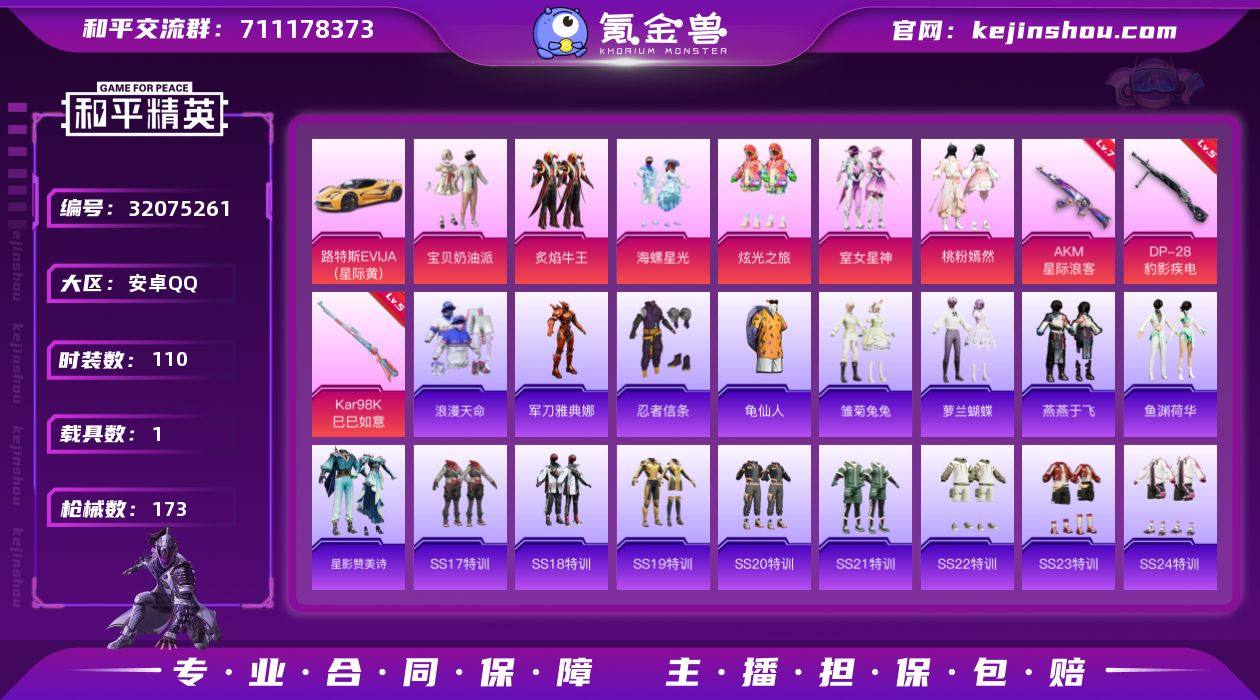 安卓 手Q-6粉装-4特效枪-1载具-3粉色飞行器-53471热力值-7王牌印记-110套装-173枪皮 【热门品类】:套装-浪漫天命,角色-军刀雅典娜,套装-忍者信条,套装-龟仙人 【粉色套装】:粉装-宝贝奶油派,粉装-炙焰牛王,粉装-海螺星光,粉装-炫光之旅,粉装-室女星神,粉装-桃粉嫣然 【粉色枪皮等级】:AKM-星际浪客(七级),UMP45-萌骑冒险(四级),Kar98K-巳巳如意(五级),DP-28-豹影疾电(五级) 【粉色载具】:路特斯EVIJA(星际黄) 【粉色枪皮】:AKM-星际浪客,UMP45-萌骑冒险,Kar98K-巳巳如意,DP-28-豹影疾电 【粉色飞行器】:闪光银龙飞行器,夜幕颂歌飞行器,月下星之子飞行器 【粉色降落伞】:梦幻火箭降落伞,夏日绵绵冰降落伞,星之彼岸降落伞,暗夜玫瑰降落伞,齐天大圣降落伞,洛神天依降落伞,百合蜜语降落伞,筑梦精灵降落伞,垂柳戏鸭降落伞,彩虹甜喵降落伞,旋转彩虹降落伞,暗夜鎏金降落伞,飒粉甜心降落伞,圣堂之誓降落伞,鎏金朋克降落伞,桃粉嫣然降落伞,幻彩电音降落伞 【稀有套装】:套装-龟仙人,套装-雏菊兔兔,套装-萝兰蝴蝶,套装-燕燕于飞,套装-鱼渊荷华,套装-星影赞美诗,角色-曹焱兵 【稀有枪皮】:AKM-墨染幽兰,AKM-彩虹符号,AKM-江南烟雨,AKM-生命誓言,AKM-筑梦精灵,AKM-虎虎生威,AKM-龙的传人,M16A4-幻世战舞者,M16A4-甜心亚梦,SCAR-L-暗夜玫瑰,SCAR-L-炫彩节奏,SCAR-L-玉兔迎春,SCAR-L-红色方程式,SCAR-L-青丘仙客,M416-糯团青竹,M416-绿野极光,M416-蓝色火焰,GROZA-彩虹符号,GROZA-恐龙拽拽,GROZA-懵萌河马,GROZA-田园牧歌,AUG-天降萌叽,AUG-甜蜜菠萝,AUG-耀粉歌者,AUG-青春冒险家,QBZ-妙趣可丽,QBZ-彩虹符号,QBZ-飞驰魅影,M762-天降萌叽,M762-彩虹甜喵,M762-瑞龙福将,M762-第五大道,Mk47-妙红点点,Mk47-洛神天依,Mk47-炫光之旅,G36C-懵萌...