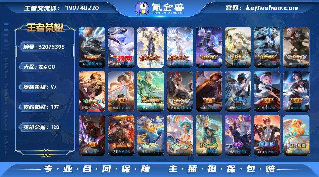 贵族7/皮肤197/典藏1/传说15/史诗58/英雄128/金标镜/敖隐全皮/影全皮/鸣剑·曳影/时之恋人-刘备/怪盗基德/愿照·山河定/愿照·千秋盛/幻光神枪/祥瑞亨通/鸣野蒿/澜逐花归海/无双飞将/音你心动-周瑜/音你心动-小乔/绛天战甲/炽阳神光/云鹰飞将/久胜战神/云霓雀翎/天穹之誓(s36)/破阵·退雄兵/谪仙醉月/阴阳师/皇家上将/奇幻香踪/猎兽之王/魔术师/海滩派对/辉光之辰/云中旅人(s29)/潮玩骑兵/原初追遂者/顽趣-梦奇/大漠名商(s28)/擒涛扼浪(s31)/探海日志(s32)/海盐诗旅(s30)/古海寻踪(s33)/高渐离燃音魔法/妲己灵卜魔法/鬼谷子天穹祈灯(S34)/琥珀纪元伽罗/妄想食味/龙武盛年/蔬乡物语(鲁班七号)/蔬乡物语(李元芳)/剑破天穹(s35)/程咬金群星魔术团/决胜骁骑/青焰无极/苍威无极/熔金海岸/噬灭天穹(s37)/谧流熔炉/虚灵犬护/逆浪荇歌/荣光之誓/星界战将/九幽镇关/破空之剑/神迹守卫/百相守梦-百里守约/百相守梦-老夫子/鸭鸭历险记-刘禅/鸭鸭历险记-沈梦溪/线条小狗-周瑜/线条小狗-小乔/万灵启世/罗小黑战记/百相守梦-黄忠/龙之律动/化蝶舞/器灵·浮梦炉/万物之道/雪上飞焰/暗渊魔法/乐园奇幻夜/月团寄思/天秀·启明/修罗/晚萤/鹰眼统帅/节奏热浪/星夜王子/逐浪之夏/天才门将/曙光守护者/特工魅影/心灵骇客/冰冠公主/黄金分割率/暗隐猎兽者/德古拉伯爵/水晶猎龙者/千年之狐/幽灵船长/绅士熊喵/圣诞狂欢/金属风暴/女仆咖啡/魅力维加斯/水果甜心/鬼剑武藏/地狱岩魂/偶像歌手/紫霞仙子/极光幻客/鹤鸣心笺/克喵/踏浪烽翎/死霸装/小满鸭/命运加冕/布丁狗之约/灵野札记/春野闲踪/浪漫序章/玫蓝誓约/景韶洛都/星梦巡礼/雪境奇遇-西施/魅影绮裳/铁骨偃魂/苍林狼骑/逐霄战戟/雾都夜雨/敬我三分/长夏之忆/暗都幽影/功夫炙烤/漠中幻影/时空谍影/完美运算/妄想特派/零食大作战/潮玩探月行/蔚蓝守将/乓乓大师/特工战影/次元突破/鲨炮海盗猫/丁...