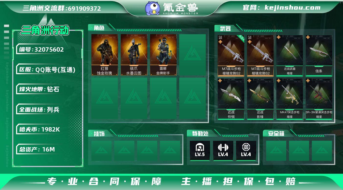 【 烽火49级 总资产17M 三角券2300 蚀金+水墨+金牌射手 暗星+影锋+怜悯+信条 体负4仓库5 s8赛季通行证已开 优品A棱镜M7 3s黑夜猎手挂饰 0封两红四刀一砖 皮肤小号】 【干员外观】:红狼-蚀金玫瑰,骇爪-水墨云图,露娜-金牌射手 【近战皮肤】:近战-暗星,近战-信条,近战-影锋,近战-怜悯,近战-黑鹰 【典藏外观】:M7战斗步枪-棱镜攻势S2 【典藏外观成色】:M7战斗步枪-棱镜攻势S2(优品A) 【传说外观】:M4A1突击步枪-蚀金玫瑰,K416突击步枪-白鹰军团,SG552突击步枪-运动员,SCAR-H战斗步枪-水墨云图,MK47突击步枪-暗星,P90冲锋枪-信条,SR-3M紧凑突击步枪-暗星,MP7冲锋枪-趣味文化,M14射手步枪-蛮荒,SR-25射手步枪-信条 【史诗外观】:ASh-12战斗步枪-碎冰行动*2,PTR-32突击步枪-碎冰行动*2,M7战斗步枪-百步穿杨,G3战斗步枪-流沙送葬,AS Val突击步枪-百步穿杨,MP5冲锋枪-竞技风,Vector冲锋枪-百步穿杨,M249轻机枪-丛影谍踪,QJB201轻机枪-炽焰,SVD狙击步枪-阿萨拉工艺,M14射手步枪-工业狂潮, M14射手步枪-航天庆典,M700狙击步枪-竞技风,M700狙击步枪-百步穿杨,AWM狙击步枪-流沙送葬,沙漠之鹰-曙光 【稀有外观】:PKM通用机枪-精湛工艺,M4A1突击步枪-繁盛,AKM突击步枪-肃杀,ASh-12战斗步枪-繁盛,K416突击步枪-一帆风顺,SG552突击步枪-2026,SG552突击步枪-马年新春,SG552突击步枪-贴花艺术,SCAR-H战斗步枪-荣耀列队,G3战斗步枪-主宰,CAR-15突击步枪-来财,MP5冲锋枪-弄臣,Vector冲锋枪-先锋,SMG-45-行动开启,勇士冲锋枪-主宰,勇士冲锋枪-冰天雪地,M1014霰弹枪-幻影结构,M249轻机枪-冰天雪地,QJB201轻机枪-哈夫克卫队,SR-25射手步枪-开拓,PSG-1射手步枪-主宰 【普通外观】:野牛冲锋枪-黄铜,Mini-14射手步枪-黄铜,P90冲锋枪-马赛克涂装,M870霰弹枪-马赛克涂装,SV-98...