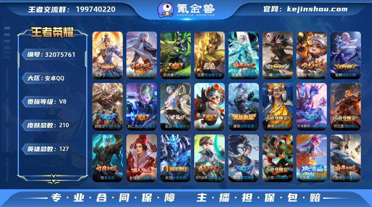实名: 可修改 性别: 男号 贵族等级: V8 英雄数: 127 皮肤数: 210 荣耀水晶: 九霄神辉 传说皮: 黄金狮子座,云鹰飞将,猫影幻舞,末日机甲-孙尚香,零号·赤焰,胖达荣荣,淬星耀世,超时空战士-狄仁杰 限定皮: 冰锋战神,遇见飞天,李小龙,游园惊梦,梁祝,御风骁将,时雨天司,蜜橘之夏,飞衡,乒乒小将,冰霜恋舞曲,逐梦之星,逐梦之影,凤求凰,青龙志,一生所爱,大圣娶亲,寅虎·瑞焰,霸王别姬-虞姬,傲雪梅枪,五谷丰年,山海·玄木吟 亮点: 【优质装备】:九霄神辉(木兰典藏),黄金狮子座,云鹰飞将(小将军),猫影幻舞,末日机甲-孙尚香(绿蚂蚱),零号·赤焰,胖达荣荣,淬星耀世,超时空战士-狄仁杰