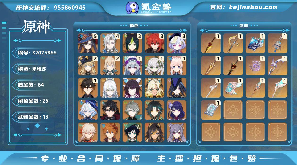 邮箱: 不送邮/死邮 总黄数: 64 冒险等级: 60 5命金色角色: 五命莫娜 4命金色角色: 四命那维莱特 3命金色角色: 三命迪卢克,三命七七,三命提纳里 2命金色角色: 二命琴,二命娜维娅 1命金色角色: 一命钟离,一命珊瑚宫心海,一命纳西妲,一命梦见月瑞希 0命金色角色: 温迪,枫原万叶,刻晴,达达利亚,魈,雷电将军,艾尔海森,迪希雅,莱欧斯利,芙宁娜,克洛琳德,希诺宁,哥伦比娅,兹白 拥有武器: 天空之翼,四风原典,天空之卷,阿莫斯之弓,风鹰剑,天空之脊,不灭月华,赤角石溃杵,圣显之钥,图莱杜拉的回忆,万世流涌大典,裁断,有乐御簾切 1精武器: 天空之翼,四风原典,天空之卷,阿莫斯之弓,风鹰剑,天空之脊,不灭月华,赤角石溃杵,圣显之钥,图莱杜拉的回忆,万世流涌大典,裁断,有乐御簾切 亮点: Y1-FK2627迪希雅,艾尔海森,温迪,雷电将军,枫原万叶,魈,达达利亚,刻晴,莱欧斯利,芙宁娜,克洛琳德,希诺宁,哥伦比娅,兹白,纳西妲,钟离,珊瑚宫心海,梦见月瑞希,琴,娜维娅,提纳里,七七,迪卢克,那维莱特,莫娜,班尼特,辛焱,砂糖,诺艾尔,北斗,香菱,罗莎莉亚,芭芭拉,行秋,菲