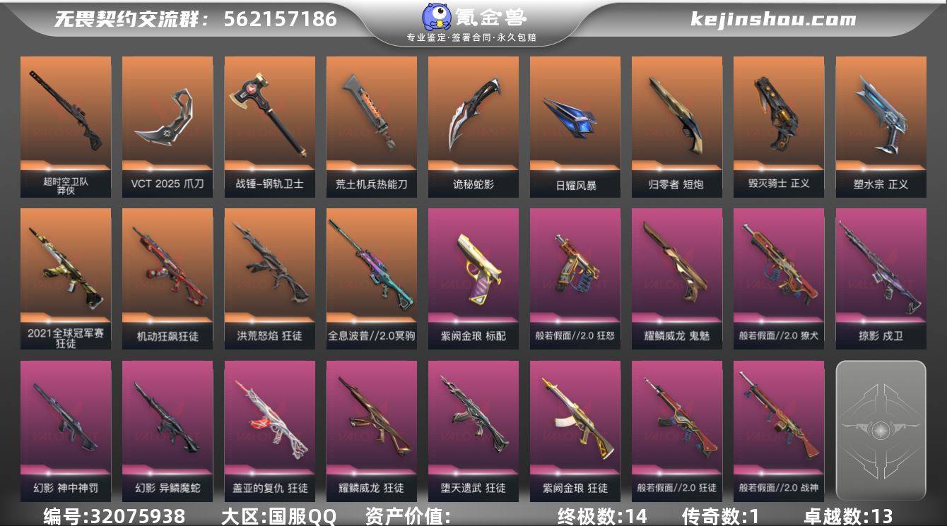 21冠军+25vct爪刀热门皮肤号 qyz9426 【近战武器】:近战武器-VCT 2025 爪刀,近战武器-威龙之刃,近战武器-鬼丸国纲,近战武器-钢轨卫士 战锤,近战武器-荒土机兵 热能刀,近战武器-诡秘蛇影 军刀,近战武器-日耀风暴 遗器 【狂徒】:狂徒-2021全球冠军赛,狂徒-洪荒怒焰,狂徒-机动狂飙,狂徒-般若假面//2.0,狂徒-堕天遗武,狂徒-盖亚的复仇,狂徒-耀鳞威龙,狂徒-紫阙金琅,狂徒-钢轨卫士,狂徒-荒土机兵,狂徒-诡秘蛇影 【幻影】:幻影-异鳞魔蛇,幻影-神中神罚,幻影-幽海幻潮,幻影-珍珠棘贝,幻影-纳米打击,幻影-战术小伙伴,幻影-末日之翼 【戍卫】:戍卫-掠影,戍卫-钢轨卫士,戍卫-珍珠棘贝,戍卫-逆冲蛮牛,戍卫-战术熊与伙伴们,戍卫-折光棱晶 【獠犬】:獠犬-般若假面//2.0,獠犬-复古浪潮,獠犬-逆冲蛮牛,獠犬-战术小伙伴 【冥驹】:冥驹-全息波普//2.0,冥驹-荒土机兵,冥驹-复古浪潮 【飞将】:飞将-光导纤维,飞将-战术熊与伙伴们,飞将-末日之翼 【莽侠】:莽侠-超时空卫队,莽侠-诡秘蛇影,莽侠-深海水族,莽侠-纤云弄巧 【战神】:战神-般若假面//2.0,战神-深海水族 【奥丁】:奥丁-流星兵团,奥丁-纳米打击,奥丁-战术小伙伴,奥丁-末日之翼 【判官】:判官-诡秘蛇影,判官-纳米打击x 【雄鹿】:雄鹿-复古浪潮,雄鹿-逆冲蛮牛 【骇灵】:骇灵-荒土机兵,骇灵-流星兵团,骇灵-珍珠棘贝,骇灵-光导纤维 【蜂刺】:蜂刺-深海水族,蜂刺-纤云弄巧,蜂刺-战术小伙伴,蜂刺-折光棱晶 【标配】:标配-紫阙金琅,标配-荒土机兵,标配-光导纤维,标配-战术熊与伙伴们,标配-折光棱晶 【正义】:正义-毁灭骑士,正义-塑水宗,正义-纳米打击,正义-纤云弄巧 【鬼魅】:鬼魅-耀鳞威龙,鬼魅-诡秘蛇影,鬼魅-光导纤维,鬼魅-星云暗涌 【狂怒】:狂怒-般若假面//2.0,狂怒-钢轨卫士,狂怒-珍珠棘贝,狂...
