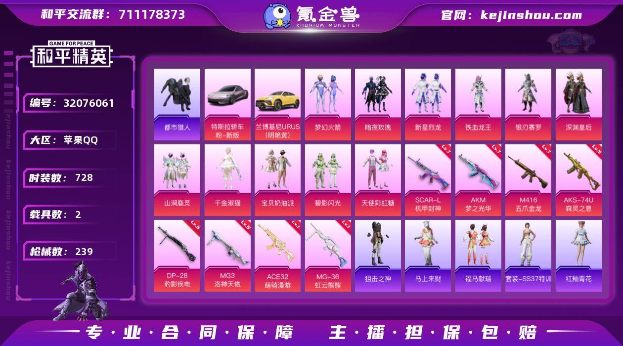 实名:可二次实名 是否支持人脸包赔:不支持 粉装数量:11 特效枪数量:8 载具数:2 时装数:728 枪械数:239 都市猎人 暗夜玫瑰,宝贝奶油派,碧影闪光,梦幻火箭,千金淑猫,山涧鹿灵,天使彩虹糖,深渊皇后,铁血龙王,新星烈龙,银刃赛罗 七级AKM-梦之光华,七级M416-五爪金龙,七级SCAR-L-机甲封神,五级AKS-74U-森灵之息,五级DP-28-豹影疾电,五级MG3-洛神天依,一级ACE32-萌骑漫游,一级MG-36-虹云熊熊 兰博基尼URUS(明艳黄),特斯拉Roadster(沁心粉) 狙击之神,马上来财,福马献瑞,红釉青花,SS37特训,雨过天青,青翼流星,月烬之祷,雪国风尚,画境星梦,琴音绮想,SS36特训,炫彩糖果,萌鸡速递,风迹短诗,SS35特训,午间小调,元气之梦,狂鲨锋刃,凌霄紫焰,擎苍青焰,SS34特训套装,朱霞炽焰,暗黑裁决,暗夜傀儡,暗夜魅影,暗夜契约,冰川特警,冰冻风暴,暴风机械师,缤纷焰火,北国孤狼,滨海厨神,滨海假日,爆裂葡萄,白色伏地魔,冰爽海盐,白熊同盟,本愿之火,长空猛禽,丛林猎人,潮流游乐家,超能拳王,传奇侦探,春日漫步,都市丽猫,都市猎人,都市魅力,风暴特警,飞驰魅影,绯格组合,疯狂小兔子,风行保卫者,福星高照,飞行日记,格斗先锋,刚毅裁决者,海滨突袭者,红潮炫舞,鹤鸣,虎虎生威吉莉,黑色伏地魔,灰色格斗者,海上生明月,黄色运动,红色运动,幻影武者,极地朋克,金环蜂王,竞技名士,竞技勇士朋克,吉莉礼服,坚韧舞者,决胜时刻,金鼠迎春,街头潮人,军械专家,酷潮明星,科技之星,空投萌叽,蓝彩潮人,浪漫天命,镭射皇者,蓝色守护者,蓝色运动,蓝甜马卡龙,冷焰舞者,漫步者,抹茶蜜豆,萌黄之夏,魅力单车,梦起落英,萌趣颜团子,暖风夏荷,逆风勇士,霓虹极客,霓虹街区,怒火燎原,牛气冲天,牛气满满,欧布奥特曼,破蛋小黄鸡,青春冒险家,绮丽涂鸦,奇趣章鱼,青团波波,瑞龙福将,软萌银虎,燃烧卡路里,人鱼之吻,圣诞大吉,时空追击者,赛罗奥特曼,沙漠兵团,神秘领域,SS10特训,SS11特训,SS12特训,SS13特训,SS14特训,SS15特训,SS16特训,SS17特训,SS18特训,SS19特训,SS2特训,SS30特训套装,SS32特训套装,SS3特训,SS4特训,SS5特训,SS6特训,SS7特训,SS8特训,SS9特训,天籁歌者,甜蜜告白,甜蜜熊情侣,特训学院,团圆交子,特种颜团子,特战装甲,WiFi精灵,完美偶像,星河入梦,迅捷之星,旭日情侣,夏日音浪,雪山精英,醒狮腾龙,雪山征服者,星影赞美诗,银白舞王,迎春赐吉,原初圣火,异彩先驱,耀粉歌者,摇滚舞王,游猎者,音速流光,野性战魂,野性战心,鹰眼刺客,夜莺强袭者,耀眼新星,战地督导,战地菁英,灼焰舞者,治愈之星 极意拳锋飞行器,炫彩糖果飞行器,风花雪月飞行器,梦幻火箭飞行器,神秘黑猫飞行器,炫彩糖果降落伞,暗夜玫瑰降落伞,海渊国主降落伞,恐龙拽拽降落伞,蓝莓炮弹降落伞,洛神天依降落伞,梦幻火箭降落伞,PEL轰鸣竞梦者降落伞,千金淑猫降落伞,四圣焕新降落伞,王牌四分卫降落伞,星穹咏叹调降落伞,香水柠檬降落伞