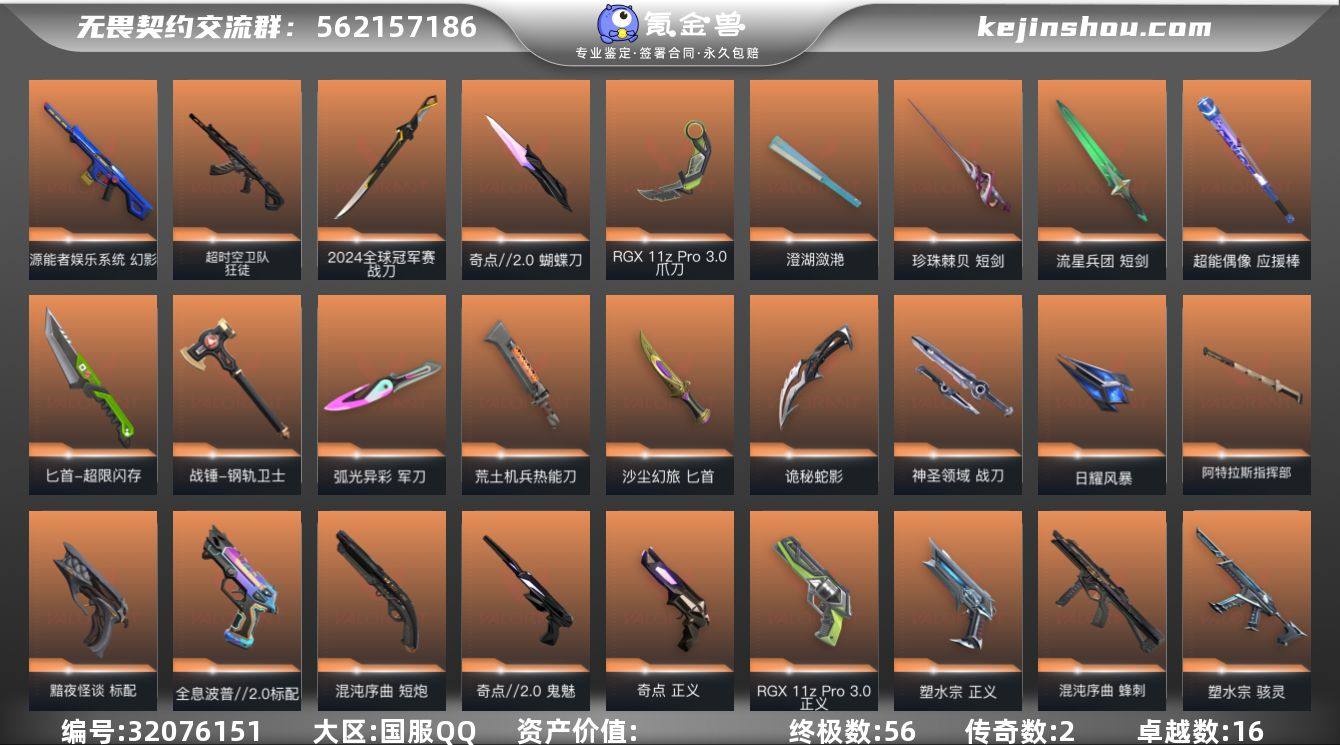 【Hww483】国服Q区 皮肤价值112870【56橙皮 2金皮 16紫皮 226皮肤 28英雄 276卡面 2370已用源晶】铂金 优质皮肤:2024全球冠军赛套装、混沌序曲套装、塑水宗套装、黯夜怪谈套装 【套装】:2024全球冠军赛套装,回火礼包// V25套装,RGX 11z Pro//3.0套装,混沌序曲套装,塑水宗套装,奇点//2.0套装,黯夜怪谈套装,全息波普//2.0套装,回火礼包:奇点套装,天界神兵//2.0套装,耀鳞威龙套装,掠影套装 【英雄】:幻棱,炼狱,维斯,暮蝶,钛狐,壹决,铁臂,捷风,雷兹,幽影,不死鸟,贤者,猎枭,蝰蛇,零,芮娜,奇乐,尚勃勒,霓虹,斯凯,夜露,星礈,K/O,海神,盖可,黑梦,钢锁 【近战武器】:近战武器-2024全球冠军赛 战刀,近战武器-奇点//2.0 蝴蝶刀,近战武器-RGX 11z Pro//3.0 爪刀,近战武器-黑波之刃,近战武器-威龙之刃,近战武器-澄湖潋滟,近战武器-珍珠棘贝 短剑,近战武器-混沌大剑,近战武器-流星兵团 短剑,近战武器-超能偶像 应援棒,近战武器-超限闪存 匕首,近战武器-钢轨卫士 战锤,近战武器-弧光异彩 军刀,近战武器-荒土机兵 热能刀,近战武器-全息战斧,近战武器-沙尘幻旅 匕首,近战武器-天御刀,近战武器-夜刃诡镰,近战武器-影刃,近战武器-诡秘蛇影 军刀,近战武器-神圣领域 战刀,近战武器-日耀风暴 遗器,近战武器-阿特拉斯指挥部 甩棍 【狂徒】:狂徒-超时空卫队,狂徒-2025全球冠军赛,狂徒-光明哨兵,狂徒-归零者,狂徒-洪荒怒焰,狂徒-混沌序曲,狂徒-奇点//2.0,狂徒-全息波普//2.0,狂徒-塑水宗,狂徒-创·纪元,狂徒-光荣异象,狂徒-堕天遗武,狂徒-掠影,狂徒-盖世英雄,狂徒-耀鳞威龙,狂徒-离子武器//2.0,狂徒-超能偶像,狂徒-钢轨卫士,狂徒-弧光异彩,狂徒-荒土机兵,狂徒-流星兵团,狂徒-沙尘幻旅,狂徒-诡秘蛇影 【幻影】:幻影-源能者娱乐系统,幻影-2024全球...