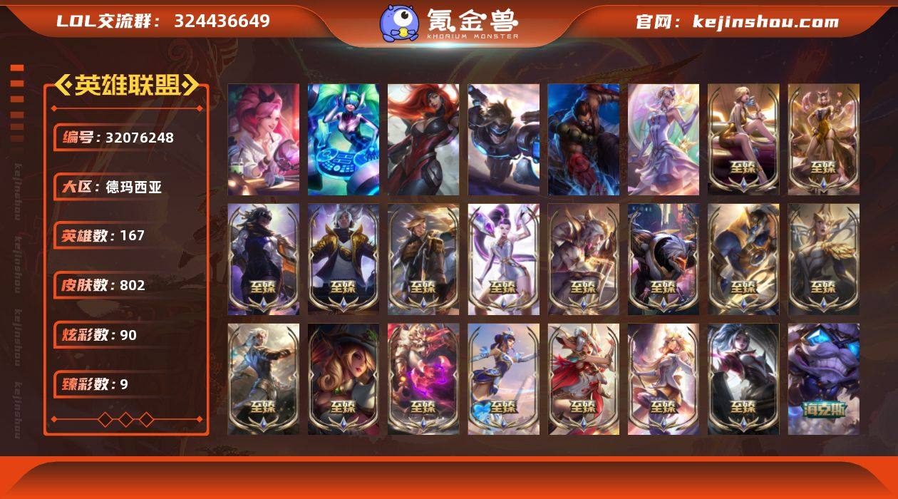 【LD5179】167英雄/802皮肤/8终极/31神话/141限定/9臻彩/90炫彩/78传说/181史诗/未定级账号等级:217/10周年 安妮/暗星 科加斯/10周年庆典 凤凰/黎明使者 卡尔玛/永恒之森 奥恩/灰烬骑士 派克/海克斯 吉格斯/海克斯 卡萨丁/海克斯 拉莫斯/海克斯 雷克顿/海克斯 瑟庄妮/海克斯 斯维因/恐惧新星 德莱厄斯/海克斯 希维尔/至臻 真实伤害 赛娜/至臻 真实伤害 亚索/至臻 飞升战神 潘森/至臻 黑夜使者 凯隐/至臻 K/DA 阿狸/至臻 K/DA ALL OUT卡莎/至臻 K/DA 伊芙琳/至臻 灵能特工 伊泽瑞尔/至臻 魅惑女巫 莫甘娜/至臻 魔女 阿卡丽/至臻 魔女 乐芙兰/至臻 女帝 黛安娜/至臻 青花瓷 拉克丝/至臻 神凰行者 烈羽焰凰 霞/至臻 神龙尊者均衡之龙 沃利贝尔/至臻 星之守护者 索拉卡/至臻 源计划:阴 劫/至爱的鹿/爱情之歌/暗星女皇拉克丝/星守索拉卡/无畏骑士 瑟庄妮 赤子初心/冠军之箭 艾希 凯旋圣装/泳池派对 奥莉安娜 优雅珠光鲸/广寒仙子 嫦娥/神龙烈焰 金克丝/美猴王 孙悟空/南天之怒 沃里克/烈焰美人 薇恩/王国机神苍狼 瑟提/王国机神玄武 盖伦/福牛守护者 安妮/福牛守护者 厄斐琉斯/猛虎下山 赵信/招财进宝 提莫/虎头虎脑 崔丝塔娜/烈焰仙子 黛安娜/龙腾虎跃 瑟提/天龙之子 斯莫德/觅心萝莉 金克丝/觅心游侠卢锡安/幽梦玫瑰 泰隆/幸福女神 乐芙兰/持胡萝卜的雪人 易/冰雪风暴 希维尔/圣诞开心鬼 提莫/圣诞精灵 崔丝塔娜/圣诞狂欢 努努/圣诞糖果棒 厄运小姐/圣诞狂欢 时光/“主人不要我了” 阿木木/胡桃夹子 小丑/平安夜女神 娑娜/英勇玩具兵船长/邪恶圣诞老人 维迦/雪默丁格/雪装 奈德丽/圣诞玩偶 波比/圣诞老人 酒桶/圣诞驯鹿 克格莫/魄罗骑士 瑟庄妮/雪球也能爆炸 吉格斯/寒冬精灵 璐璐/圣诞捣蛋鬼 金克丝/冰雪节 炼金/冰雪节 马尔扎哈/冰雪节 格雷福斯/大元素使/DJ-娑娜/K/DA ALL OUT-萨勒芬妮 独立音乐人/灵魂守卫/未来战...