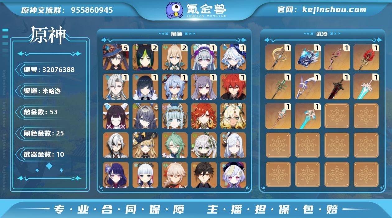 邮箱: 送网易邮箱 总黄数: 53 冒险等级: 60 5命金色角色: 五命莫娜 2命金色角色: 二命琴,二命提纳里 1命金色角色: 一命迪卢克,一命刻晴,一命甘雨,一命夜兰,一命那维莱特,一命芙宁娜,一命梦见月瑞希 0命金色角色: 枫原万叶,神里绫华,七七,钟离,雷电将军,申鹤,纳西妲,白术,娜维娅,阿蕾奇诺,希诺宁,玛薇卡,伊涅芙,菈乌玛,哥伦比娅 拥有武器: 狼的末路,和璞鸢,阿莫斯之弓,天空之傲,天空之刃,天空之脊,护摩之杖,最初的大魔术,万世流涌大典,裁断 1精武器: 狼的末路,和璞鸢,阿莫斯之弓,天空之傲,天空之刃,天空之脊,护摩之杖,最初的大魔术,万世流涌大典,裁断 亮点: Y1-MQZ8791白术,纳西妲,钟离,雷电将军,枫原万叶,神里绫华,七七,申鹤,娜维娅,阿蕾奇诺,希诺宁,玛薇卡,伊涅芙,菈乌玛,哥伦比娅,甘雨,迪卢克,刻晴,夜兰,那维莱特,芙宁娜,梦见月瑞希,提纳里,琴,莫娜,班尼特,砂糖,诺艾尔,北斗,香菱,罗莎莉亚,迪奥娜,行秋,菲谢尔,卡维,柯莱,米卡,珐露珊,坎蒂丝,多莉,鹿野院平藏,久岐忍,夏洛蒂,夏沃蕾,狼的末路,护摩之杖,天空之脊,天空之刃,天空之傲