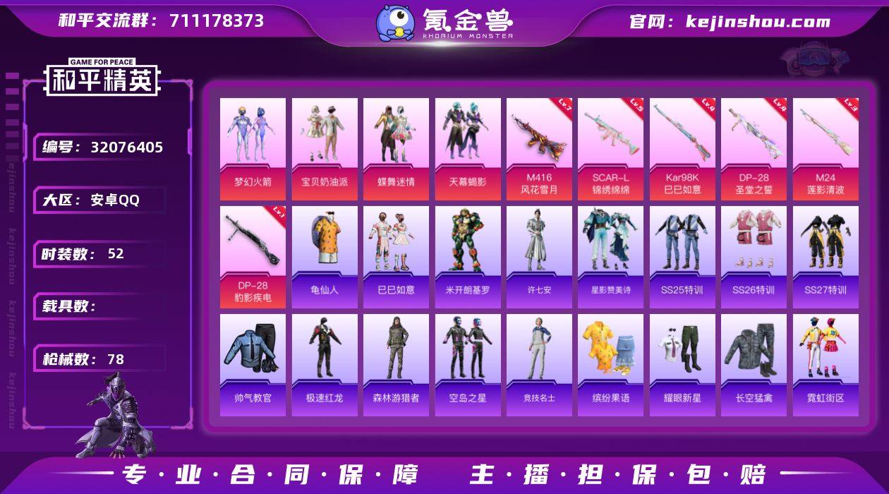 无二次-安卓 手Q-4粉装-6特效枪-0载具-1粉色飞行器-24797热力值-2王牌印记-52套装-78枪皮 【热门品类】:粉装-梦幻火箭,套装-龟仙人 【粉色套装】:粉装-宝贝奶油派,粉装-蝶舞迷情,粉装-梦幻火箭,粉装-天幕蝎影 【粉色枪皮等级】:SCAR-L-锦绣绵绵(五级),M416-风花雪月(七级),Kar98K-巳巳如意(四级),M24-莲影清波(三级),DP-28-圣堂之誓(四级),DP-28-豹影疾电(一级) 【粉色枪皮】:SCAR-L-锦绣绵绵,M416-风花雪月,Kar98K-巳巳如意,M24-莲影清波,DP-28-圣堂之誓,DP-28-豹影疾电 【粉色飞行器】:镜域双华-灵镜之阶 【粉色降落伞】:春暖花开降落伞,炫光之旅降落伞,莲影清波降落伞,镜域双华降落伞,临安公主降落伞 【稀有套装】:套装-龟仙人,套装-巳巳如意,角色-米开朗基罗,角色-许七安,套装-星影赞美诗 【稀有枪皮】:AKM-2P战斗服款,AKM-春暖花开,AKM-龙的传人,M16A4-幻世战舞者,M416-糯团青竹,GROZA-春暖花开,QBZ-洛神天依,AC-VAL-快闪甜心,Famas-镜域双华,UZI-啾咪啾咪,UZI-天降萌叽,UZI-影袭,Vector-焰鹰斗篷,Vector-彩虹符号,汤姆逊-天降萌叽,MP5K-怪笑疯兔,P90-快闪甜心,P90-巳巳如意,Kar98K-彩虹符号,M24-炫彩节奏,AWM-焰鹰斗篷,SKS-未来歌姬,SKS-迅猛狂鲨,VSS-彩虹符号,Mini14-耀粉歌者,莫辛纳甘-蜜语绒猫,M417-惊鸿侠骨,M417-猪猪侠,MK20-H-快闪甜心,MK20-H-莲影清波,M200-惊鸿侠骨,S686-巳巳如意,S12K-玩趣呆呆,DBS-焰鹰斗篷,M249-彩虹符号,DP-28-焰鹰斗篷,MG3-镜域双华,MG3-幻世战舞者,MG3-惊鸿侠骨,短管霰弹-星穹咏叹调,蝎式手枪-闲梦青缨,沙漠之鹰-快闪甜心,TMP-9-江南烟雨,TMP-9-未来歌姬,战术弩-江南烟雨,爆炸猎弓-惊鸿侠骨,破片手榴弹-巳巳如意 【其他套装】:套装-SS25特训,套装-SS26特训,套装-SS27特训,套装-帅气教官,...