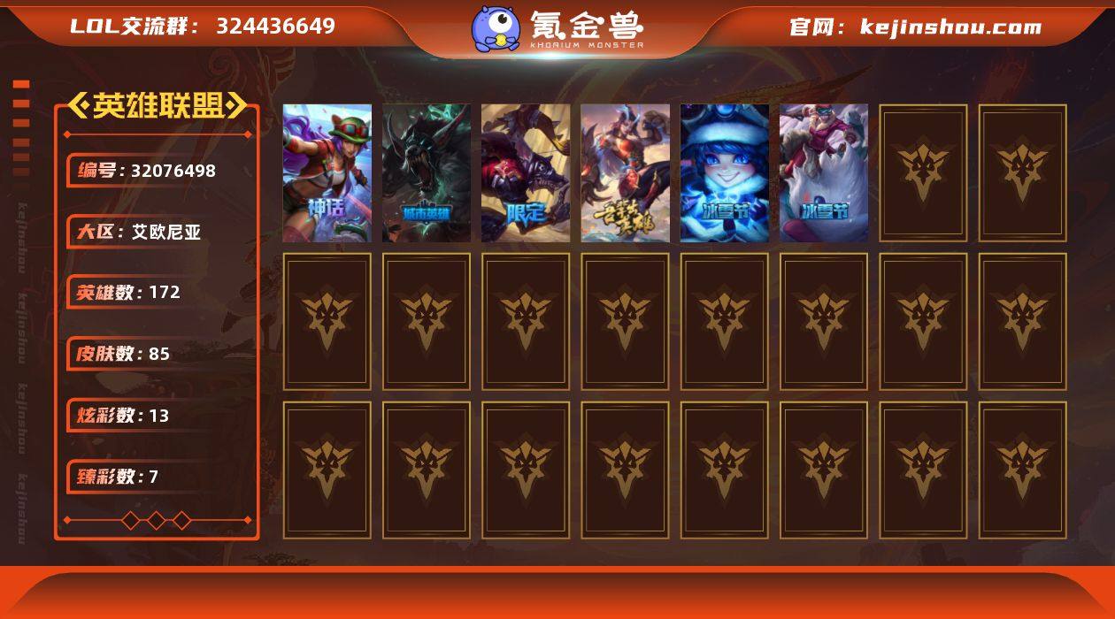 【LOLYH1583】172英雄/85皮肤/1神话/7限定/7臻彩/13炫彩/10传说/16史诗/未定级/十五周年纪念 希维尔/无畏骑士 瑟庄妮 赤子初心/闭月之颜 貂蝉 炫金莲华/幻灵战斗兔 锐雯 梦幻强袭/灵魂莲华 锐雯 流火/破败军团 厄运小姐 灵岛征伐使/水晶玫瑰 斯维因 纯洁花蕾/龙马烈焰波比/魄罗骑士 瑟庄妮/寒冬精灵 璐璐/暗裔英雄 盖伦/暗影 沃里克/都铎王朝 图奇/玉剑传说 舞龙卫/地狱之门卫士 加里奥/合金巨兽 努努和威朗普/恶魔之刃 泰达米尔/电玩女神 娑娜/腥红之月 鬼武姬 阿卡丽/死亡骑士 盖伦/焰尾妖狐 阿狸/光明哨兵 格雷福斯/星之守护者 金克丝/源计划:毁灭 派克/铁钩船长 费德提克/地狱火 阿利斯塔/狼外婆 沃里克/法国皇室 厄运小姐/穿着正装的恶魔 维迦/古墓丽影 凯特琳/符文战神 雷克顿/腥红之月 伊莉丝/铁血女忍 阿卡丽/钢铁烈阳 蕾欧娜/兔女郎 锐雯/深海怪鱼 克格莫/海牛猎手 菲兹/铁血帝皇 德莱厄斯/源代码 丽桑卓/糖果之王 艾翁/钢铁终结者赛恩/黑暗骑士奥拉夫/幽蓝梦魇加里奥/电锯狂人厄加特/幻执事乐芙兰/波江星神弗拉基米尔/联合王国费德提克/后场堡垒阿利斯塔/部落精神瑞兹/宗师级法师训练师瑞兹/森林女神索拉卡/游击队员崔丝塔娜/我羽饰骑士崔丝塔娜/西部牛仔厄运小姐/嘻哈精神基兰/冲浪高手辛吉德/惊天魔盗伊芙琳/暴龙科加斯/极度深寒拉莫斯/战栗之毒蒙多/凌云之翼艾瑞莉娅/奥德赛卡尔玛/里尔击球手特朗德尔/赏金猎人卡特琳娜/黑色玫瑰假面舞会伊莉丝/哥特女仆奥莉安娜/独眼海盗兰博/太空律动串烧大师兰博/未来战士潘森/KDAALLOUT阿卡丽/荣誉使者玛尔扎哈/灵魂莲华锐雯/炎爆慎/荣誉使者慎/北地风暴沃利贝尔/禁魔石巨像诺提勒斯/传统造型瑟庄妮/泳池派对 德莱文/幽魂骑士赫卡里姆/杰斯光明之锤/死亡之鹰奎因/荣誉使者阿克尚/斗魂觉醒烬/狗粮克烈/永恒之森阿兹尔/深渊恐惧锤石/怨之砂派克/灵魂莲华永恩/战斗...