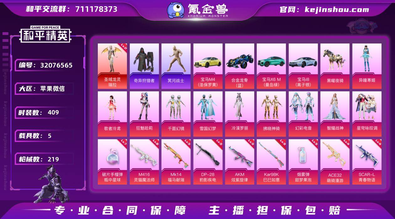 实名:可二次实名 是否支持人脸包赔:支持 粉装数量:10 特效枪数量:17 载具数:5 时装数:409 枪械数:219 冥河战士,奇异狩猎者 二级圣域龙灵-瑞拉 异瞳寒姬,拂晓神骑,歌者泠鸢,幻彩电音,狂魅哈莉,冷漠罗丽,千面幻镜,雪国幻梦,星穹咏叹调,智耀战神 七级破片手榴弹-瓶中星球,六级M416-灵猫魔法师,五级MK14-福马献瑞,五级DP-28-豹影疾电,五级AKM-炫紫旋律,五级Kar98K-巳巳如意,五级烟雾弹-甜梦果泡,四级ACE32-萌骑漫游,四级AKS-74U-星穹咏叹调,四级AMR-智耀战神,四级DP-28-罗征,四级M762-激战未来,四级MG-36-幻彩电音,四级P90-冷漠罗丽,四级SCAR-L-青春物语,三级Kar98K-圣域龙灵,三级M416-风花雪月 宝马i8(离子银),宝马M4(圣保罗黄),宝马X6 M(曼岛绿),合金龙骨(蓝),黑曜夜骑 狙击之神,魂电,马上有钱,福马献瑞,红釉青花,SS37特训,雨过天青,青翼流星,雪国风尚,SS36特训,冥河战士,奇异狩猎者,炫彩糖果,粉黛兰香,萌鸡速递,SS35特训,超感刻度,元气之梦,漫游都市,喜羊羊,薄荷星砂,狂鲨锋刃,凌霄紫焰,擎苍青焰,SS34特训套装,朱霞炽焰,暗影哥特,冰川格斗者,冰川特警,冰冻风暴,白色伏地魔,白熊同盟,春光漫游,彩虹兔,长空猛禽,顶瓜瓜,蝶变,大橘大利,绯格组合,粉恋花,诡诞巡游,瑰梦爱神,龟仙人,海岛探路者,鹤鸣,海琴烟,幻羽潜行,惊鸿侠骨,竞技名士,极速光影,街头潮人,锦衣飞扬,绛羽幽主,酷潮明星,空岛之星,快乐星愿,快闪甜心,蓝冰羽,龙的传人,灵公主,浪漫假日,恋语绒绒,猎影月神,漫步者,蜜露汐语,霓虹街区,霓虹热舞,云朵鹅,热血青春,沙暴袭击者,深海梦境,SS24特训,SS25特训,SS26特训,SS27特训,SS28特训,SS29特训,SS30特训套装,SS31特训套装,SS32特训套装,SS33特训套装,巳巳如意,时希公主,甜蜜菠萝,特殊使命,涂山之恋,完美偶像,王牌教练,小丑鱼,星梦畅游,雪绒豹,旭日情侣,星渊小夜曲,星影赞美诗,乐音,鹰眼刺客,焰鹰斗篷,鱼渊荷华,燕燕于飞,异域银装,智谋强哥,紫幽梦 僚机-圣域龙宝,炫彩糖果飞行器,繁龙极客飞行器,幻星舰长飞行器,镜光幻境飞行翼,灵猫魔法师飞行器,千面幻镜飞行器,时光之吻飞行器,终晖之翼飞行器,绝对恒星降落伞,炫彩糖果降落伞,异瞳寒姬降落伞,繁龙极客降落伞,伏魔团降落伞,幻彩电音降落伞,镜光幻境降落伞,冷漠罗丽降落伞,灵猫魔法师降落伞,萌物绒绒降落伞,宁雨蝶降落伞,圣斗士星矢降落伞,时光之誓降落伞,时光之吻降落伞,圣域龙灵降落伞,未来歌姬降落伞,星穹咏叹调降落伞,炫紫旋律降落伞,荧海星豚降落伞,智耀战神降落伞,最终圣卫者降落伞
