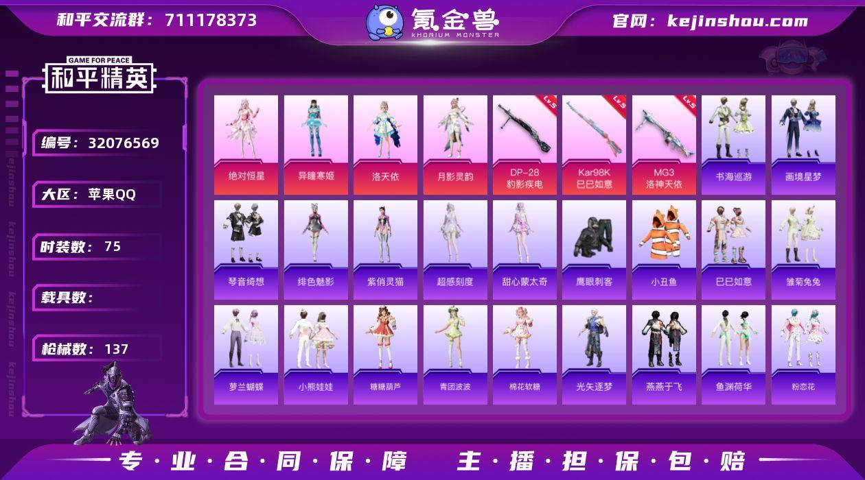 【特价出售/店主推荐】苹果 手Q-4粉装-6特效枪-0载具-1粉色飞行器-35114热力值-7王牌印记-75套装-137枪皮 【热门品类】:套装-小丑鱼 【粉色套装】:角色-绝对恒星,角色-洛天依,角色-月影灵韵,角色-异瞳寒姬 【粉色枪皮等级】:ACE32-萌骑漫游(二级),AKS-74U-森灵之息(五级),Kar98K-巳巳如意(五级),Mk14-福马献瑞(五级),DP-28-豹影疾电(五级),MG3-洛神天依(五级) 【粉色枪皮】:ACE32-萌骑漫游,AKS-74U-森灵之息,Kar98K-巳巳如意,Mk14-福马献瑞,DP-28-豹影疾电,MG3-洛神天依 【粉色飞行器】:炫彩糖果飞行器 【粉色降落伞】:绝对恒星降落伞,洛神天依降落伞,异瞳寒姬降落伞,炫彩糖果降落伞,罪夜之冕降落伞 【稀有套装】:套装-巳巳如意,角色-超感刻度,角色-甜心蒙太奇,套装-雪国风尚,套装-炫彩糖果,套装-马上有钱,套装-雏菊兔兔,套装-萝兰蝴蝶,套装-小熊娃娃,套装-糖糖葫芦,套装-青团波波,套装-棉花软糖,角色-光矢逐梦,套装-燕燕于飞,套装-鱼渊荷华,套装-粉恋花,套装-紫幽梦,套装-蓝冰羽,角色-猎影月神,角色-灵公主,角色-绯色魅影,角色-紫俏灵猫,套装-书海巡游,套装-画境星梦,套装-琴音绮想 【稀有枪皮】:AUG-冰晶雪宝,AKM-破晓战魂,AKM-龙的传人,SCAR-L-炫彩节奏,M416-红色方程式,M416-蓝色火焰,GROZA-影袭,GROZA-治愈之星,AUG-耀粉歌者,AUG-绝对恒星,QBZ-彩虹符号,QBZ-洛神天依,M762-天降萌叽,M762-彩虹符号,M762-登顶巅峰,Mk47-洛神天依,G36C-星穹咏叹调,ACE32-画境星梦,UZI-啾咪啾咪,UZI-影袭,UZI-红色方程式,UMP45-蓝色火焰,UMP45-极意拳锋,汤姆逊-天降萌叽,汤姆逊-炫彩节奏,汤姆逊-耀粉歌者,MP5K-画境星梦,P90-巳巳如意,Kar98K-影袭,Kar98K-洛神天依,SKS-迅猛狂鲨,Mk14-治愈之星,SLR-娇憨猪猪,M417-惊鸿侠骨,M1加兰德-画境星...