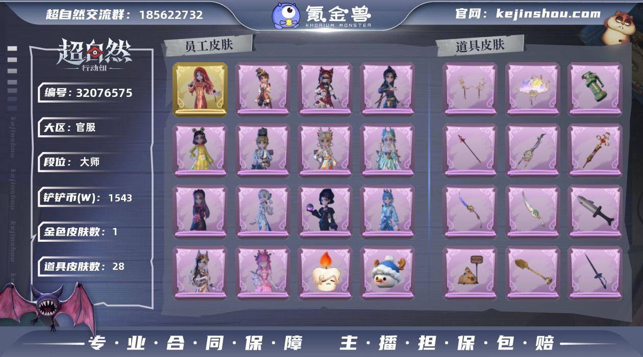 金色皮肤数量: 1 紫色皮肤数量: 13 道具皮肤数量: 28 段位: 大师 外观: 镜花辞,王子与骑士,灵昭鹿鸣,瑞羽衔春,丝缕哀歌,素影瑶光,黑月挽歌,水王子,白光莹,情公主,云梦之星,毛球夹子,天使的呼唤,蝶恋花,小鲨包包,天使消失的年代,钗头凤,呱呱雨衣,绣春逍影,绒团小狐狸,九色祥鹿,莓果陷阱,樱桃奶油布丁,雪墩墩头套,太空鲨头套,庆宴绮愿,烛光纪念,牛啤背包